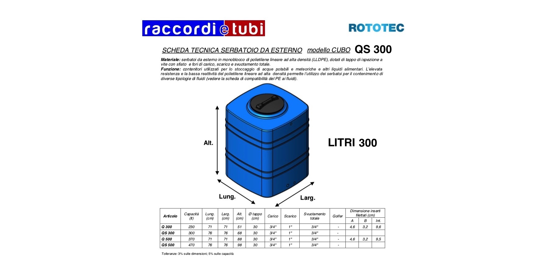 Materiale: serbatoi da esterno in monoblocco di polietilene lineare ad alta densità (LLDPE), dotati di tappo di ispezione a vite con sfiato e fori di carico, scarico e svuotamento totale. Funzione: contenitori utilizzati per lo stoccaggio di acque potabili e meteoriche e altri liquidi alimentari. L’elevata resistenza e la bassa reattività del polietilene lineare ad alta densità permette l’utilizzo dei serbatoi per il contenimento di diverse tipologie di fluidi (vedere la scheda di compatibilità del PE ai fluidi). Uso e manutenzione: le cisterne sopportano sbalzi di temperatura esterna da – 20 °C a 80 °C, non sono soggette a deterioramenti nel tempo ed i materiali utilizzati assicurano la massima affidabilità per quanto riguarda problemi di corrosione ed ossidazione. La struttura in monoblocco garantisce robustezza e solidità in quanto non sono presenti saldature che potrebbero indebolire le parti sollecitate da tensioni interne. Per esigenza di installazione è possibile praticare fori nei serbatoi negli appositi piani. Le superfici lisce dei serbatoi consentono una facile manutenzione, la leggerezza un facile trasporto ed installazione. Inoltre il costo è nettamente inferiore al metallo, al cemento e alla vetroresina. Disponibilità colori: di serie: azzurro; su richiesta: verde, terracotta, grigio