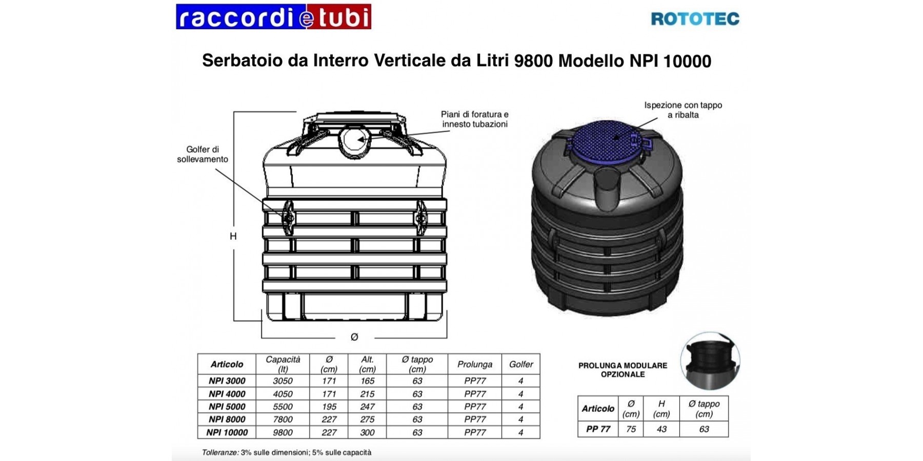 SCHEDA TECNICA SERBATOIO DA INTERRO modello PANETTONE Corrugato (NPI) Materiale: serbatoio da interro corrugato in monoblocco di polietilene lineare ad alta densità (LLDPE), dotato di tappo di ispezione ribalta con lucchetto per chiusura in sicurezza. Funzione: contenitori utilizzati per lo stoccaggio di acque potabili e meteoriche ed altri liquidi alimentari. L’elevata resistenza e la bassa reattività del polietilene lineare ad alta densità permette l’utilizzo dei serbatoi per il contenimento di diverse tipologie di fluidi (vedere la scheda di compatibilità del PE ai fluidi). Uso e manutenzione: le cisterne non sono soggette a deterioramenti nel tempo ed i materiali utilizzati assicurano la massima affidabilità per quanto riguarda problemi di corrosione ed ossidazione. La struttura in monoblocco garantisce robustezza e solidità in quanto non sono presenti saldature che potrebbero indebolire le parti sollecitate da tensioni interne. Per esigenza di installazione è possibile praticare fori nei serbatoi sugli appositi piani. Le superfici lisce dei serbatoi consentono una facile manutenzione, la leggerezza un facile trasporto ed installazione. Inoltre il costo è nettamente inferiore al metallo, al cemento e alla vetroresina. Modularità: grazie all’installazione di giunti flangiati in PE è possibile collegare più serbatoi per ottenere elevati accumuli. Disponibilità colori: nero, grigio marmorizzato. Installazione: seguire scrupolosamente le “MODALITÀ D’INTERRO” fornite da ROTOTEC.