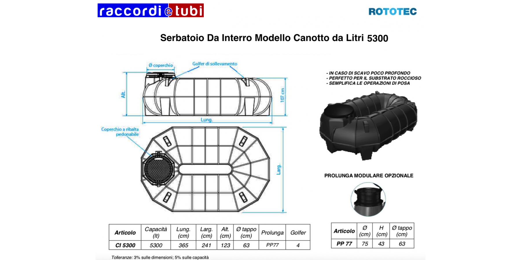 SCHEDA TECNICA SERBATOIO DA INTERRO mod.CANOTTO Materiale: serbatoi da interro in monoblocco di polietilene lineare ad alta densità (LLDPE), dotati di tappo di ispezione a vite o a ribalta a seconda dei modelli. Funzione: contenitori utilizzati per lo stoccaggio di acque potabili e meteoriche. L’elevata resistenza e la bassa reattività del polietilene lineare ad alta densità permette l’utilizzo dei serbatoi per il contenimento di diverse tipologie di fluidi (vedere la scheda di compatibilità del PE ai fluidi). Uso e manutenzione: le cisterne non sono soggette a deterioramenti nel tempo ed i materiali utilizzati assicurano la massima affidabilità per quanto riguarda problemi di corrosione ed ossidazione. La struttura in monoblocco garantisce robustezza e solidità in quanto non sono presenti saldature che potrebbero indebolire le parti sollecitate da tensioni interne. Per esigenza di installazione è possibile praticare fori nei serbatoi sugli appositi piani. Le superfici lisce dei serbatoi consentono una facile manutenzione, la leggerezza un facile trasporto ed installazione. Inoltre il costo è nettamente inferiore al metallo, al cemento e alla vetroresina. Modularità: grazie all’installazione di giunti flangiati in PE è possibile collegare più serbatoi per ottenere elevati accumuli. Disponibilità colori: nero, grigio marmorizzato. Installazione: seguire scrupolosamente le “MODALITÀ D’INTERRO” fornite da ROTOTEC.
