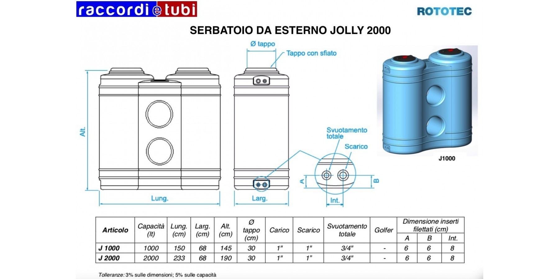 Materiale: serbatoi da esterno in monoblocco di polietilene lineare ad alta densità (LLDPE), dotati di tappo di ispezione