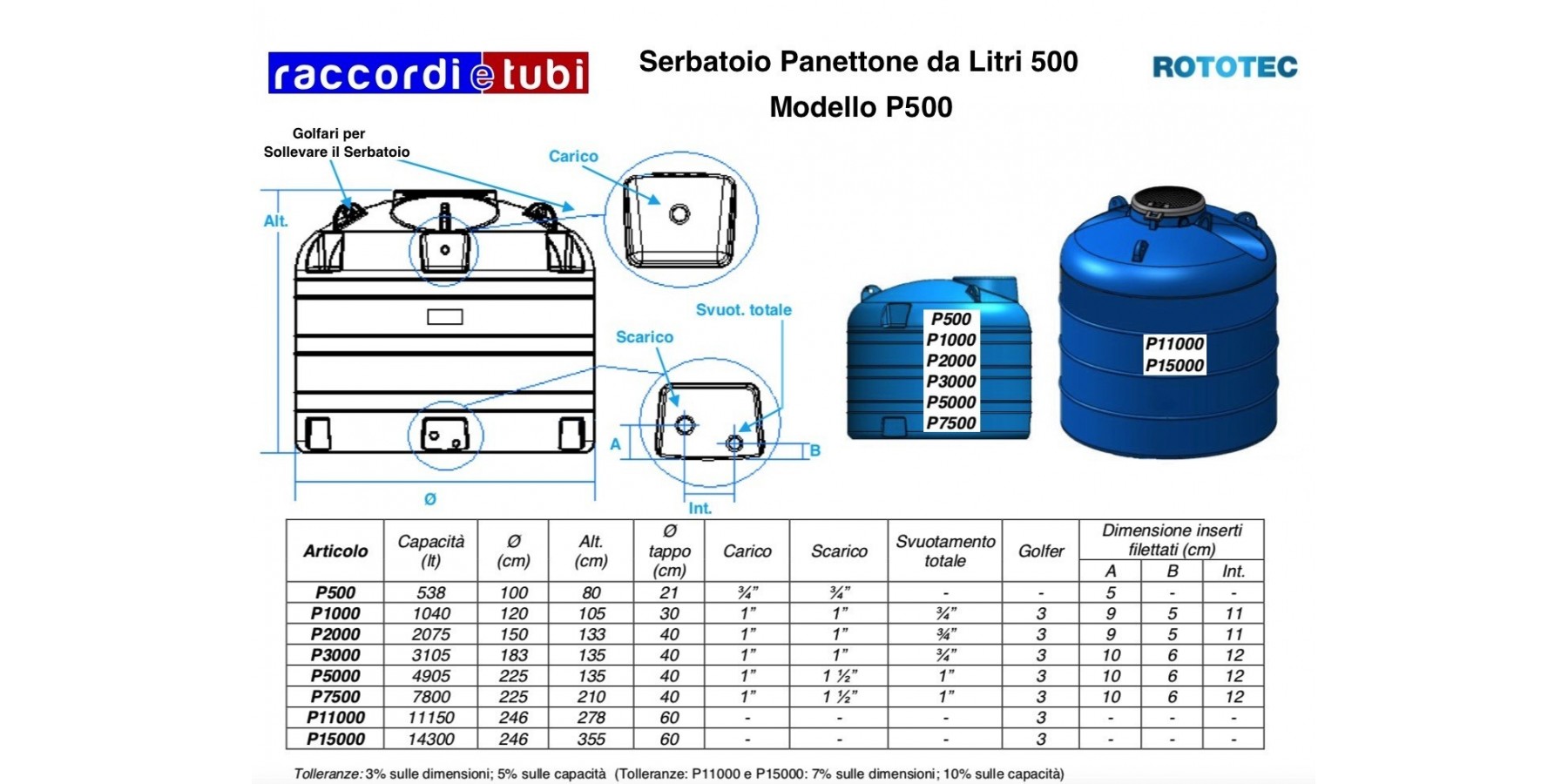 Materiale: serbatoi da esterno in monoblocco di polietilene lineare ad alta densità (LLDPE), dotati di tappo di ispezione a vite con sfiato e fori di scarico e svuotamento totale.