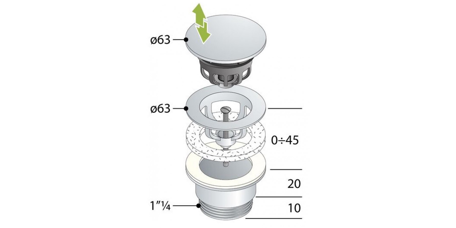 Meccanismo clicker, tappo coprente, vite passante per lavabi di spessore fino a 60 mm. Tappo metallico D.63