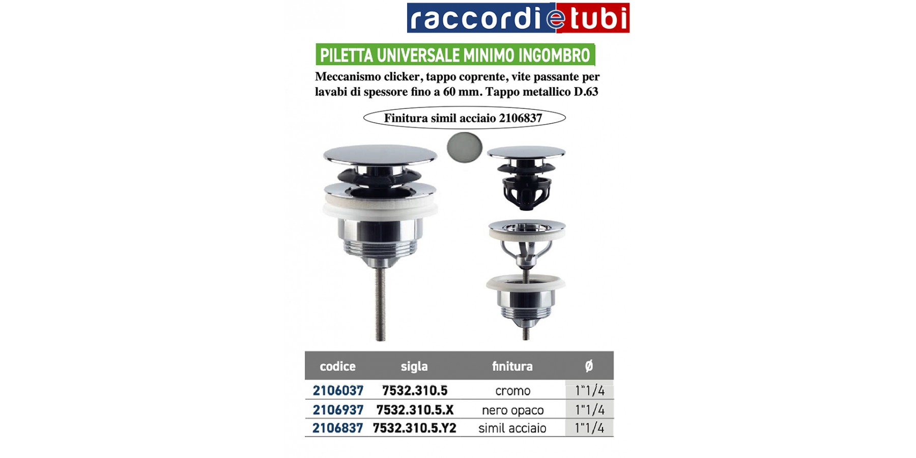 Meccanismo clicker, tappo coprente, vite passante per lavabi di spessore fino a 60 mm. Tappo metallico D.63