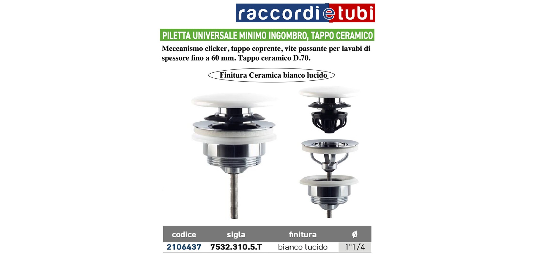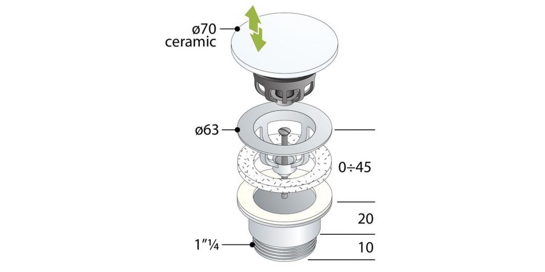 Meccanismo clicker, tappo coprente, vite passante per lavabi di spessore fino a 60 mm. Tappo ceramico D.70.