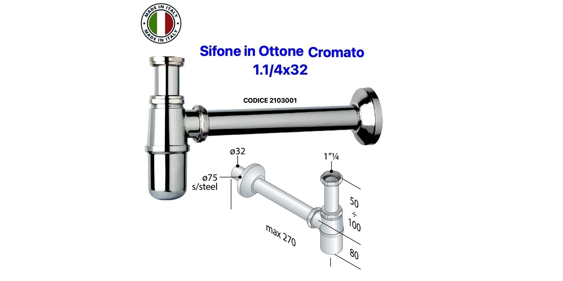 SIFONE LAVABO A BOTTIGLIA 1.1/4X32 IN OTTONE CROMATO