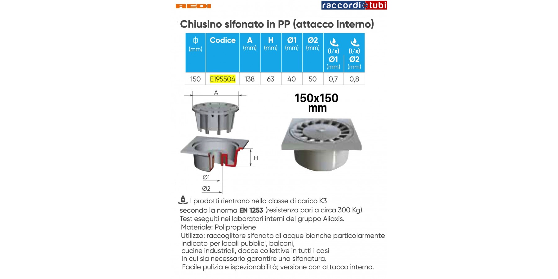 CHIUSINO SIFONATO CM.15X15 REDI E195504 IN POLIPROPILENE CON DOPPIO ATTACCO INTERNO 40/50