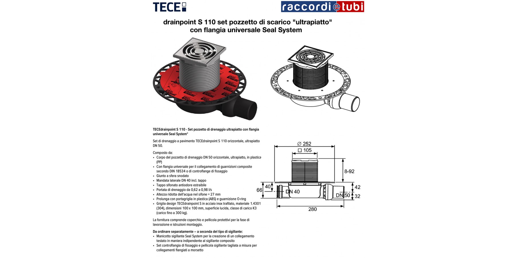 Set di drenaggio a pavimento TECEdrainpoint S 110 orizzontale, ultrapiatto DN 50.