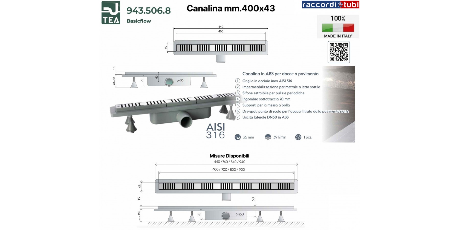 CANALINA PER DOCCIA 400X43mm TEA OMP ''BASICFLOW"
