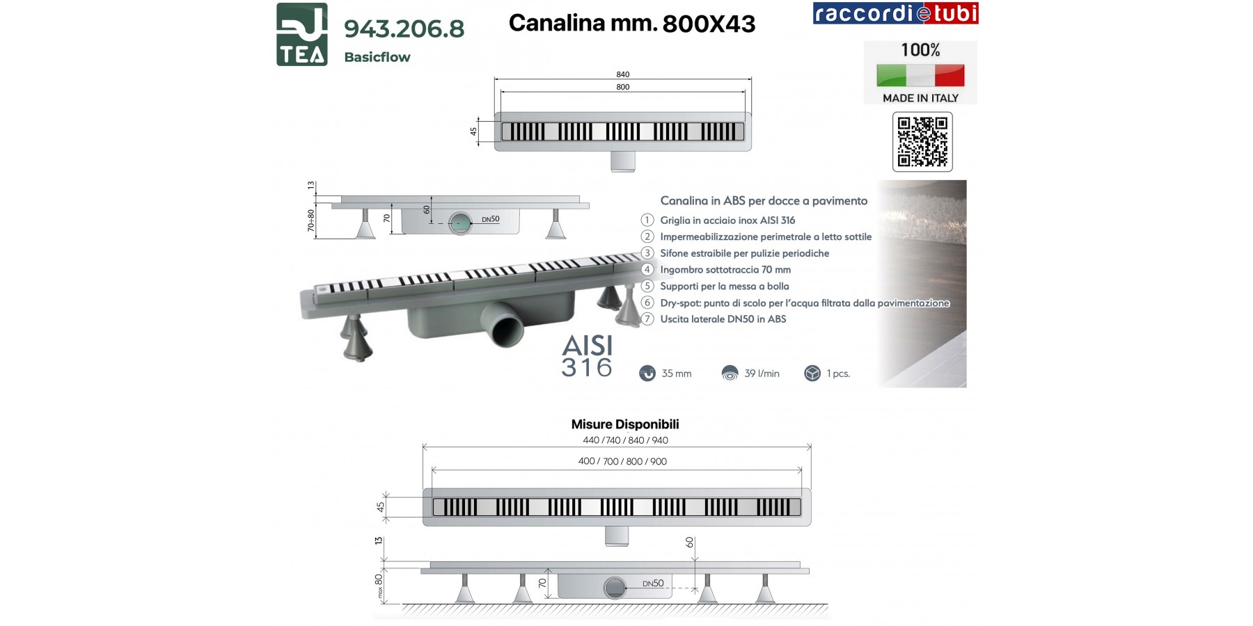 CANALINA PER DOCCIA 800X43mm TEA OMP ''BASICFLOW"