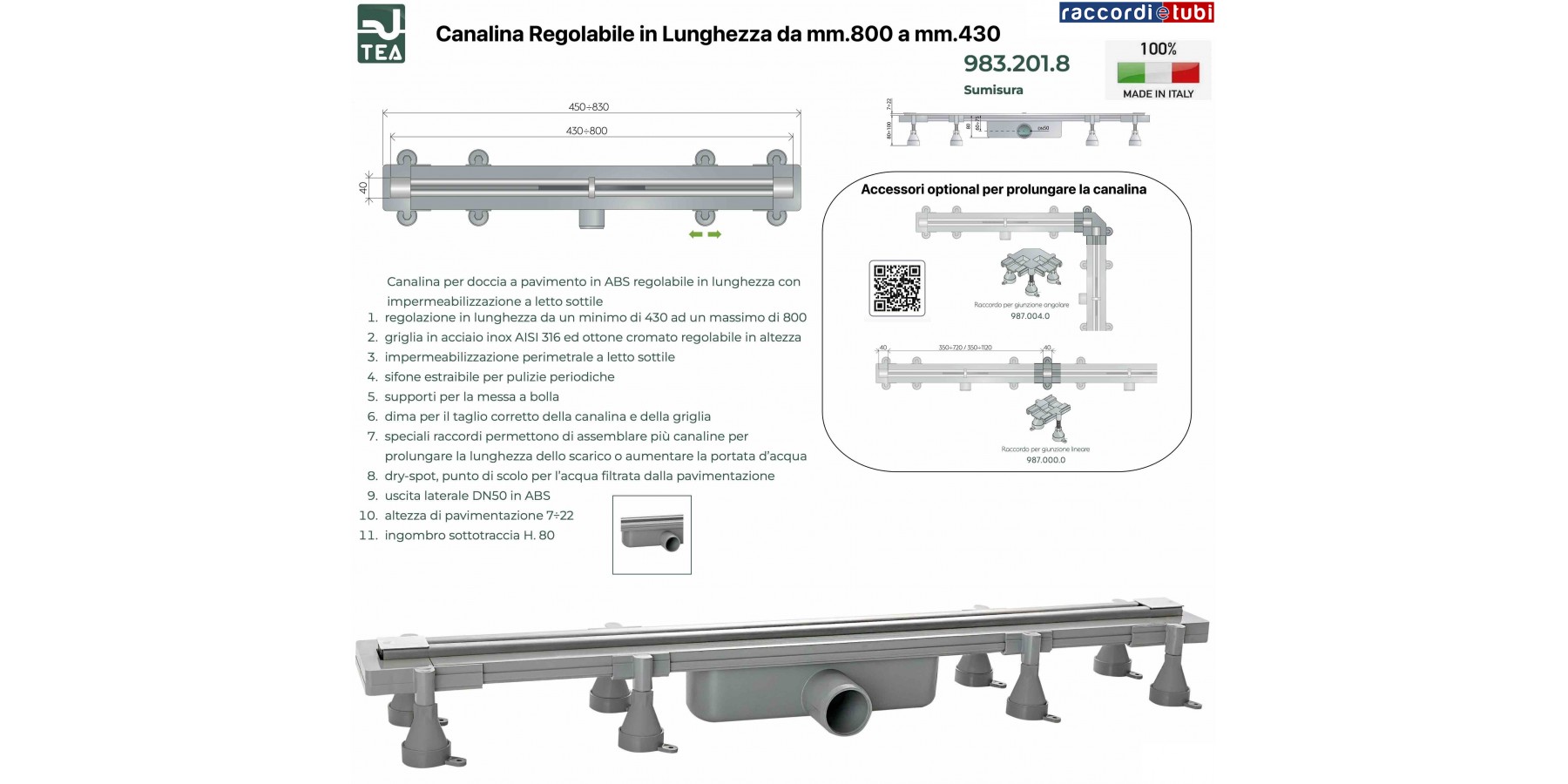Caratteristiche: - canalina in ABS - regolabile in lunghezza da max 830 mm a min. 430 mm - griglia acciaio inox AISI 316 regolabile in altezza da 7 a 22 mm - supporti scorrevoli adatti a ogni lunghezza e regolabili in altezza - chiusura idraulica 35 mm - portata d'acqua 36 lt/min - ingombro sotto il pavimento di 75mm - compreso DIMA per il corretto taglio della canalina e della griglia Con i raccordi speciali (2304972 e 2304974) è possibile assemblare più canaline