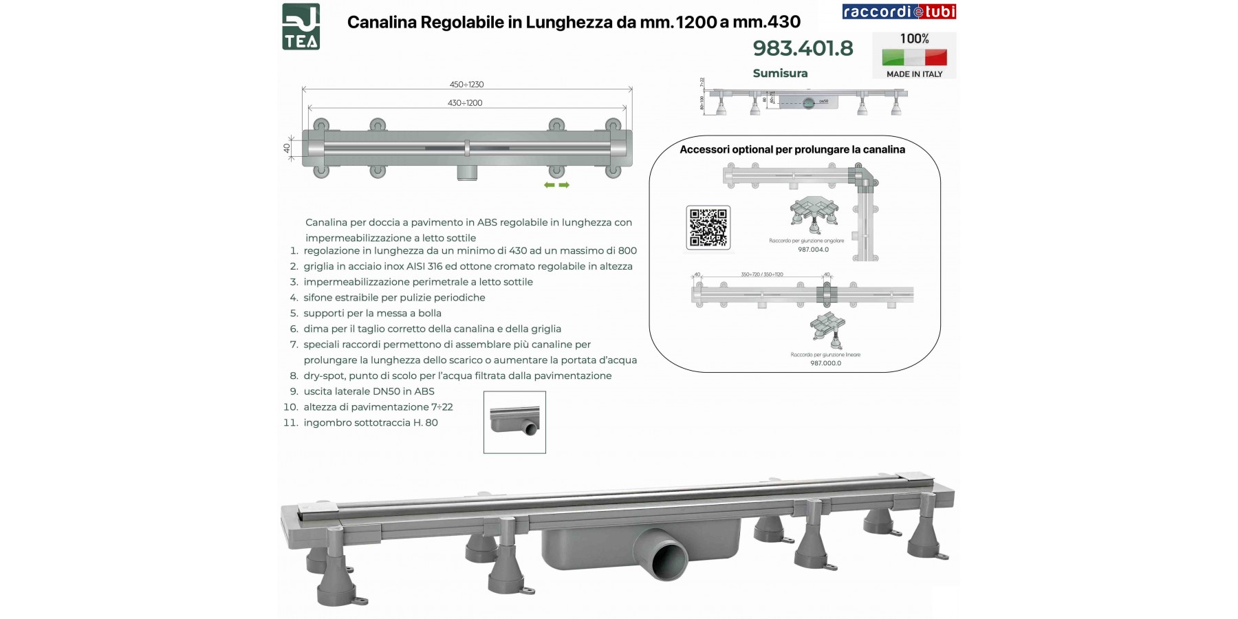 Caratteristiche: - canalina in ABS - regolabile in lunghezza da max 1.200 mm a min. 430 mm - griglia acciaio inox AISI 316 regolabile in altezza da 7 a 22 mm - supporti scorrevoli adatti a ogni lunghezza e regolabili in altezza - chiusura idraulica 35 mm - portata d'acqua 36 lt/min - ingombro sotto il pavimento di 75mm - compreso DIMA per il corretto taglio della canalina e della griglia Con i raccordi speciali (2304972 e 2304974) è possibile assemblare più canaline