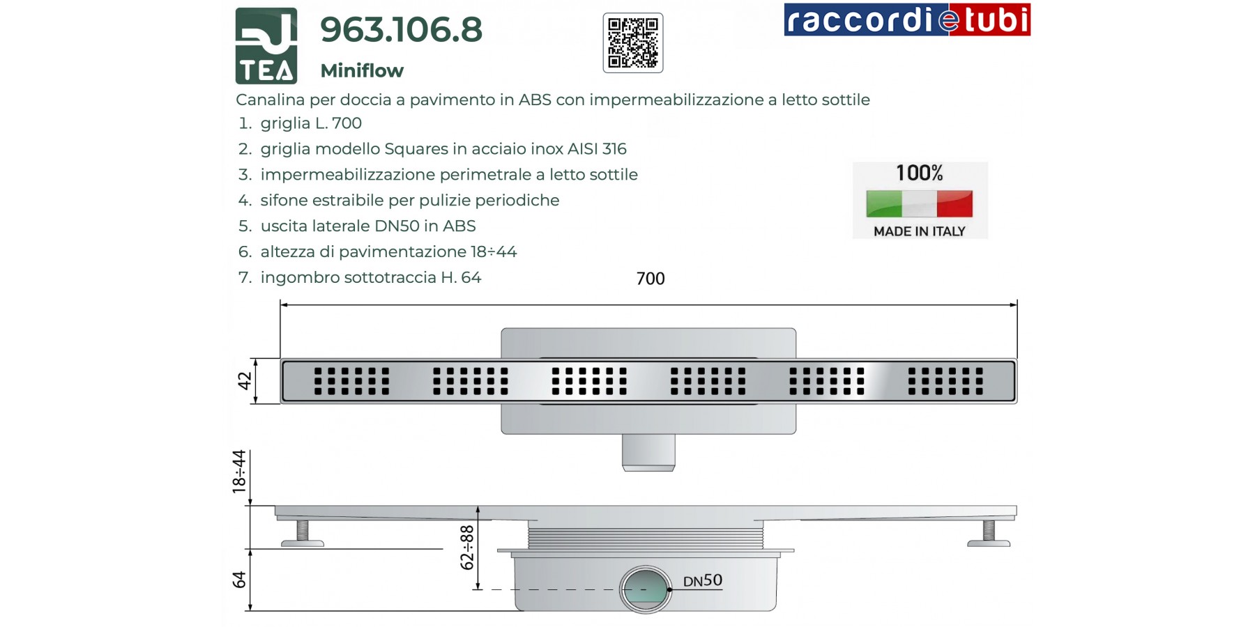 CANALINA PER DOCCIA MINIFLOW LINEARE mm.700X42 TEA OMP COMPLETA DI TELO