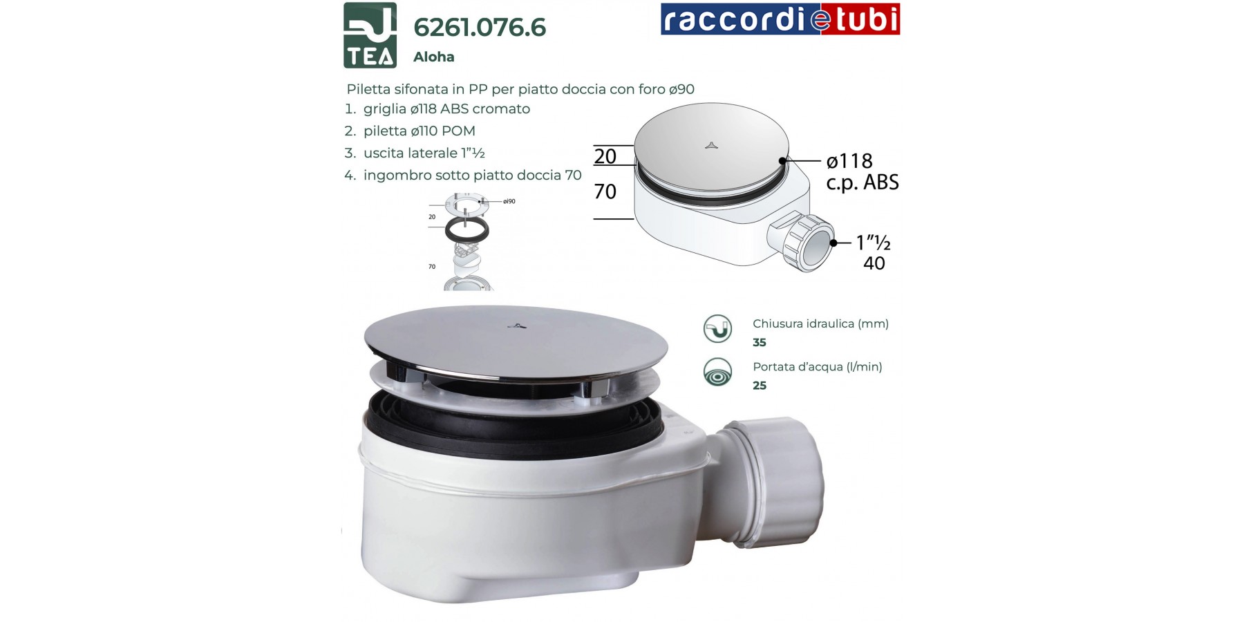 Griglia coprente D.118 in ABS, sifone e cestello ferma-capelli amovibili, guarnizione tre lamelle adatta ai piatti doccia in acrilico che quelli in ceramica, uscita con ghiera. Basso ingombro, portata d’acqua maggiorata.