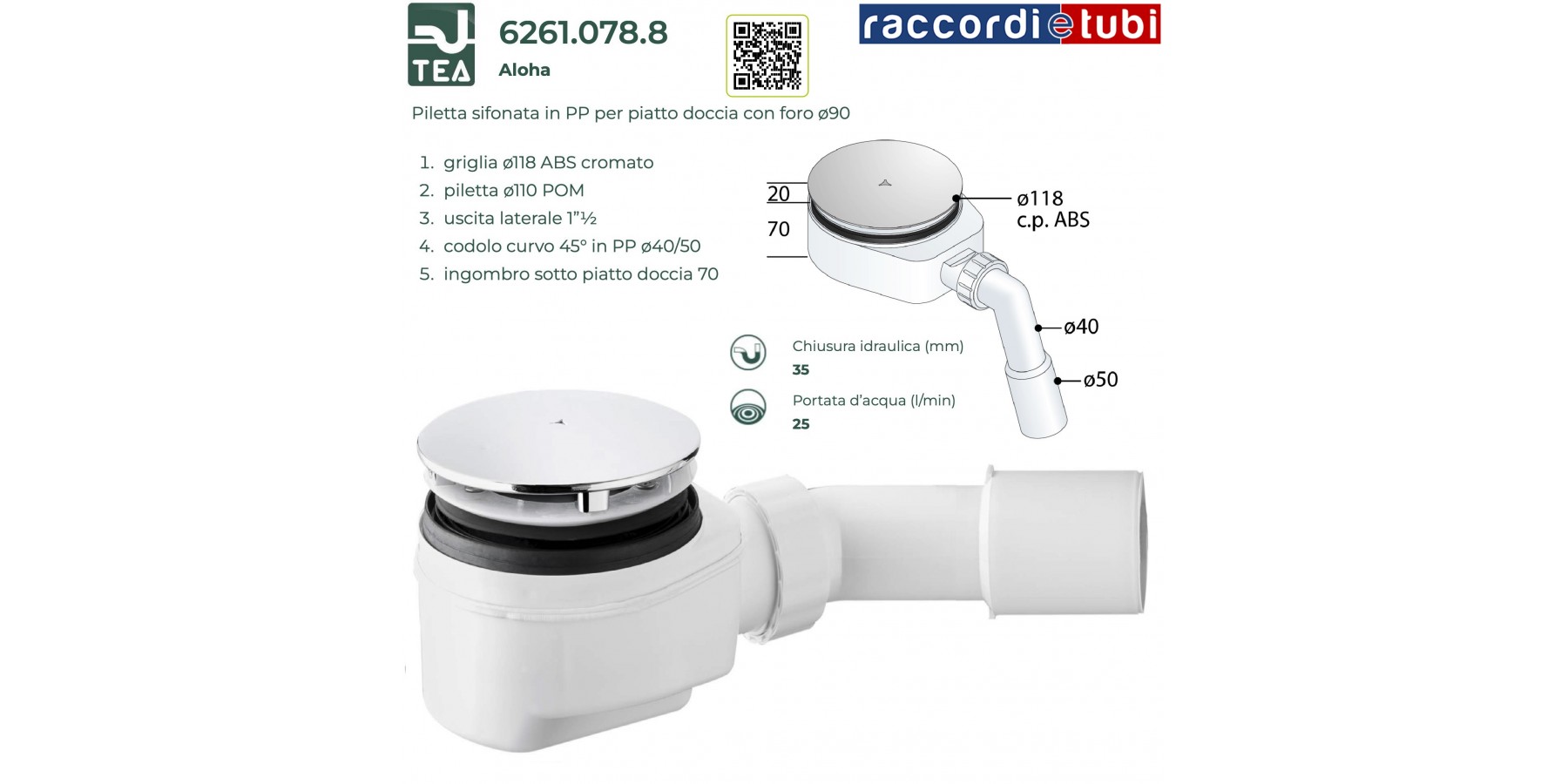 Griglia coprente D.118 in ABS, sifone e cestello ferma-capelli amovibili, guarnizione tre lamelle adatta ai piatti doccia in acrilico che quelli in ceramica, uscita con codolo 45° in PP. Basso ingombro, portata d’acqua maggiorata. Fissaggio con viti.