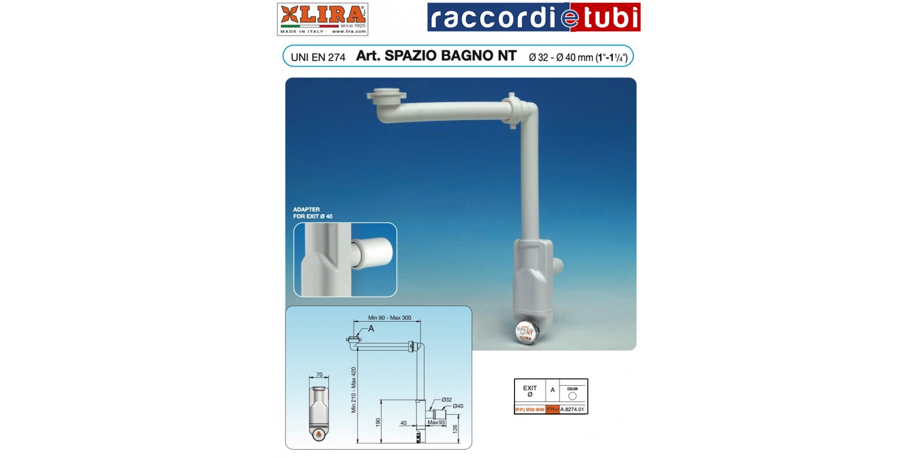 SIFONE LIRA SPAZIO BAGNO NT SCARICO 32X1.1/4 SCARICO 40 A.8274.01