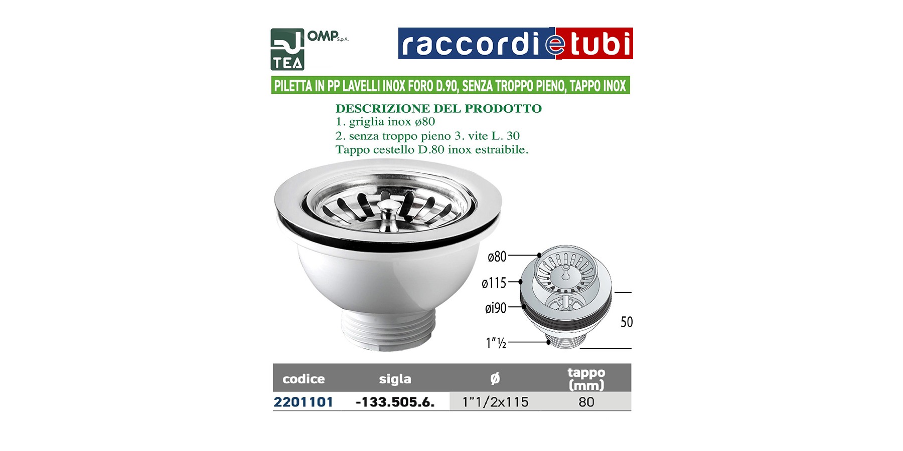 PILETTA IN PP LAVELLI INOX FORO DIAMETRO 90mm TAPPO ESTRAIBILE E GRLIGLIA INOX