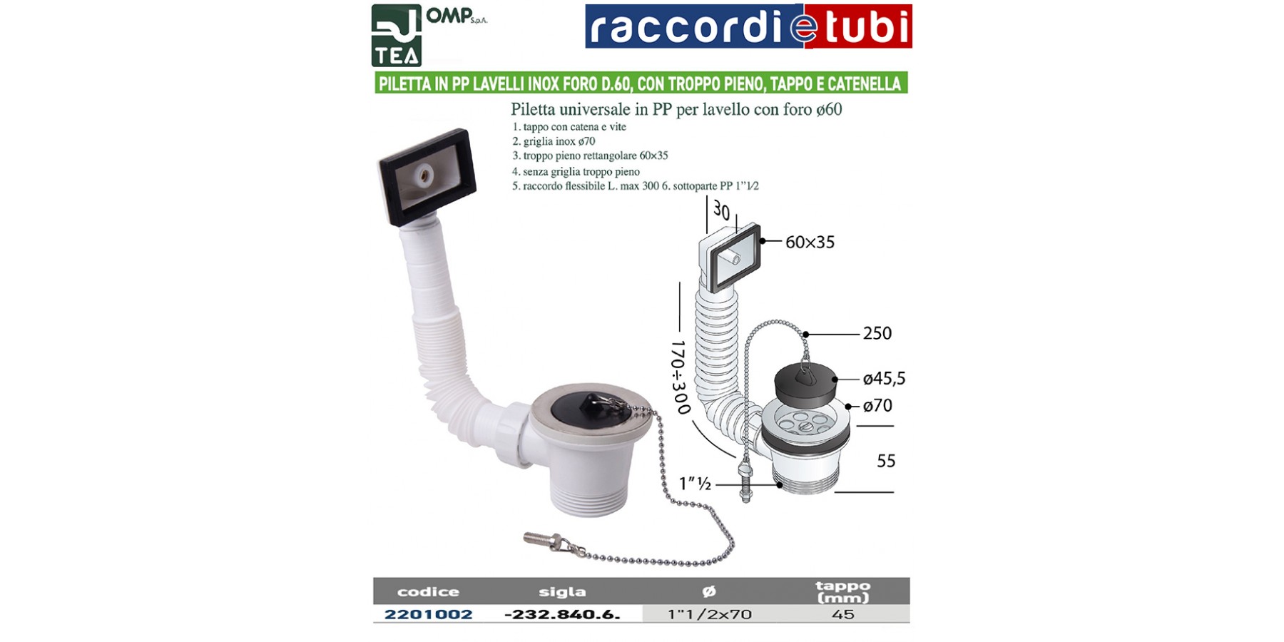 PILETTA IN PP LAVELLI INOX FORO DIAMETRO 60,CONTROPPOPIENO,TAPPO E CATENELLA 1.1/2