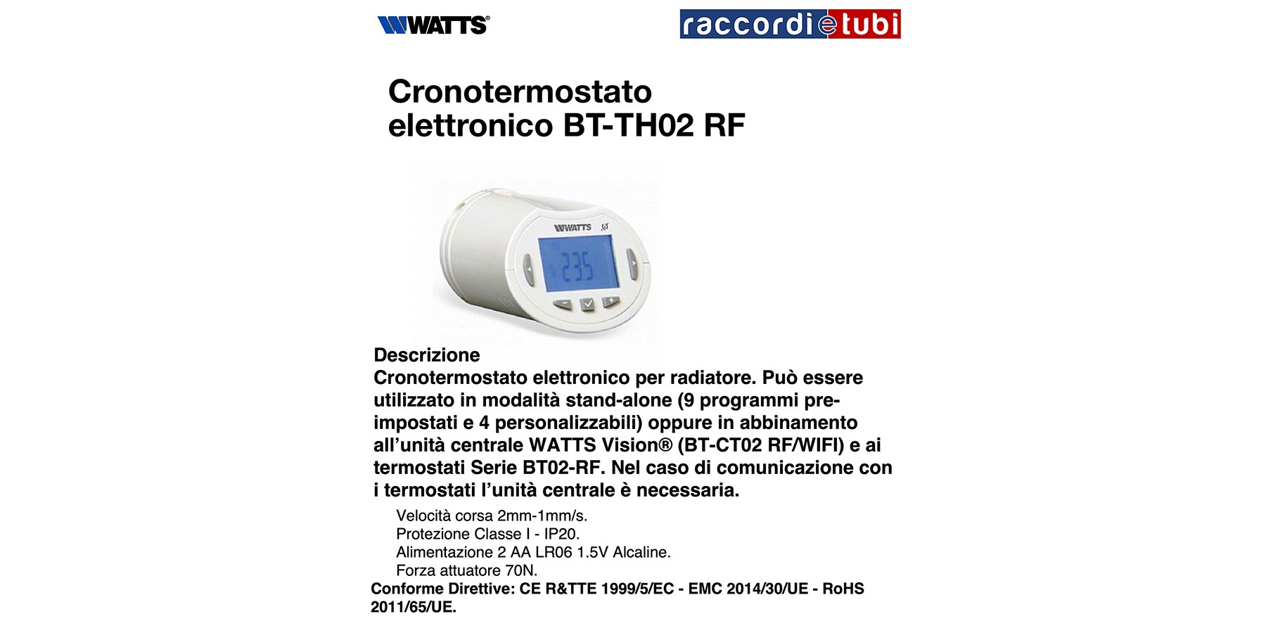 Cronotermostato elettronico per radiatore. Può essere utilizzato in modalità stand-alone (9 programmi pre-impostati e 4 personalizzabili) oppure in abbinamento all’unità centrale WATTS Vision® (BT-CT02 RF/WIFI) e ai termostati Serie BT02-RF. Nel caso di comunicazione con i termostati l’unità centrale è necessaria.