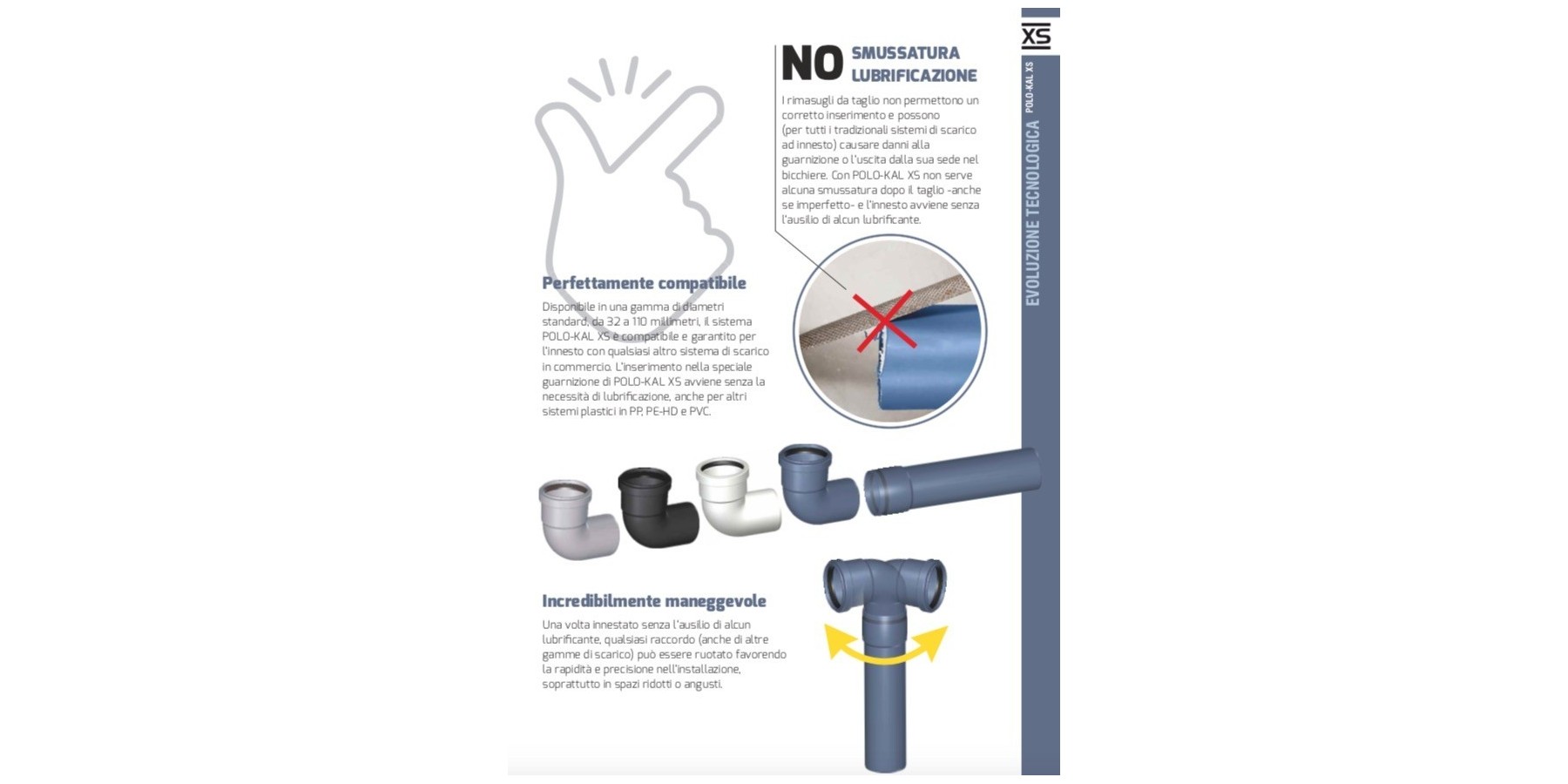 Sistema estremamente maneggevole e rapido da installare grazie alla giunzione ad innesto senza necessità di lubrificazione, con guarnizione elastomerica inserita direttamente nel bicchiere (funTEC technologie). Ciò impedisce qualsiasi possibilità di perdita della guarnizione nelle fasi di stoccaggio, trasporto o posa del materiale. Con il sistema POLO-KAL XS sino a 10 metri di colonna non è richiesto il consueto spazio nel bicchiere per la dilatazione. Il sistema in polipropilene POLO-KAL XS è compatibile alla connessione con altri materiali plastici in PP/PE-HD/PVC nei diametri standard.