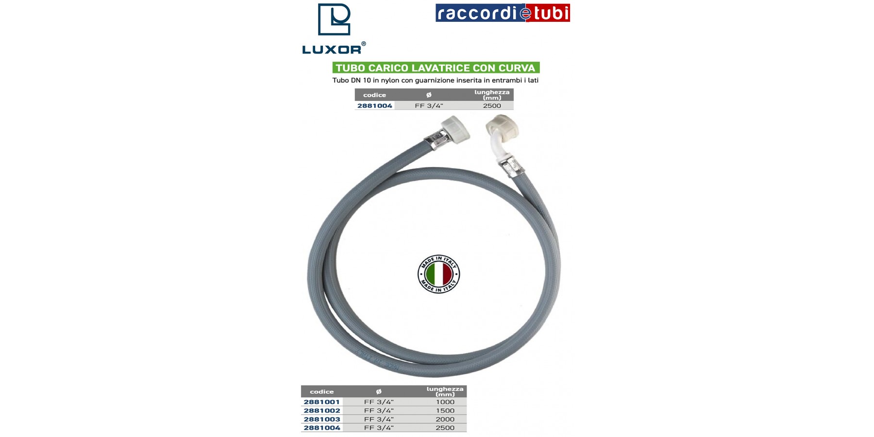 TUBO CARICO LAVATRICE CON CURVA FF 3/4'' 2500 mm IN GOMMA TELATA NYLON