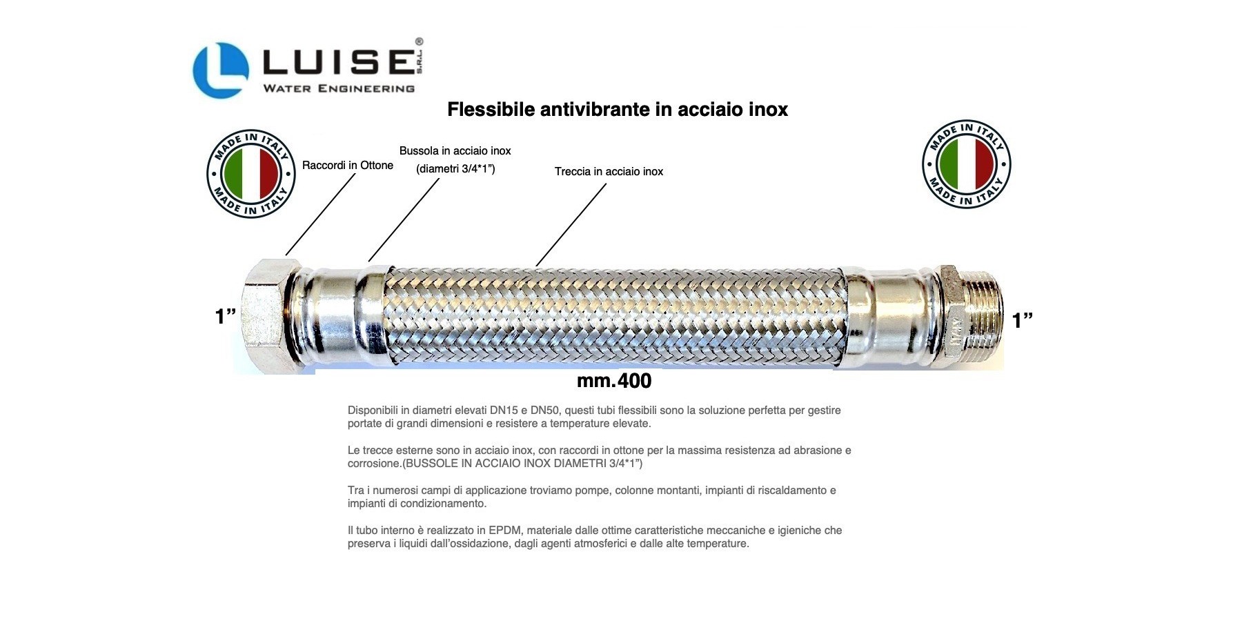 Antivibrante trecciatura in acciaio inox gomma EPDM con raccordi maschio femmina in ottone nichelato,portagomma interno in ottone bussole in acciaio inox AISI 304 (nei diametri 3/4 e 1")