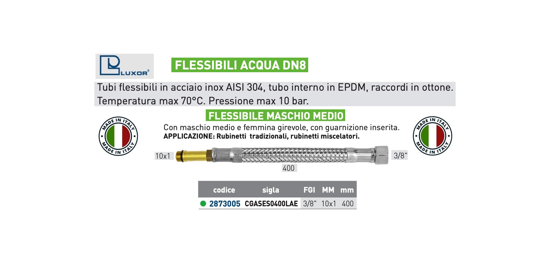 Temperatura max 70°C. Pressione max 10 bar