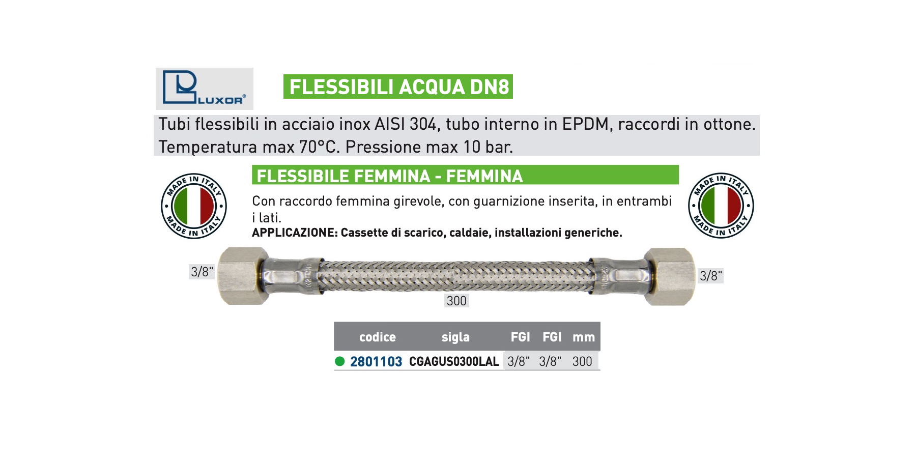 Tubi flessibili in acciaio inox AISI 304 DN8, tubo interno in EPDM, raccordi in ottone.