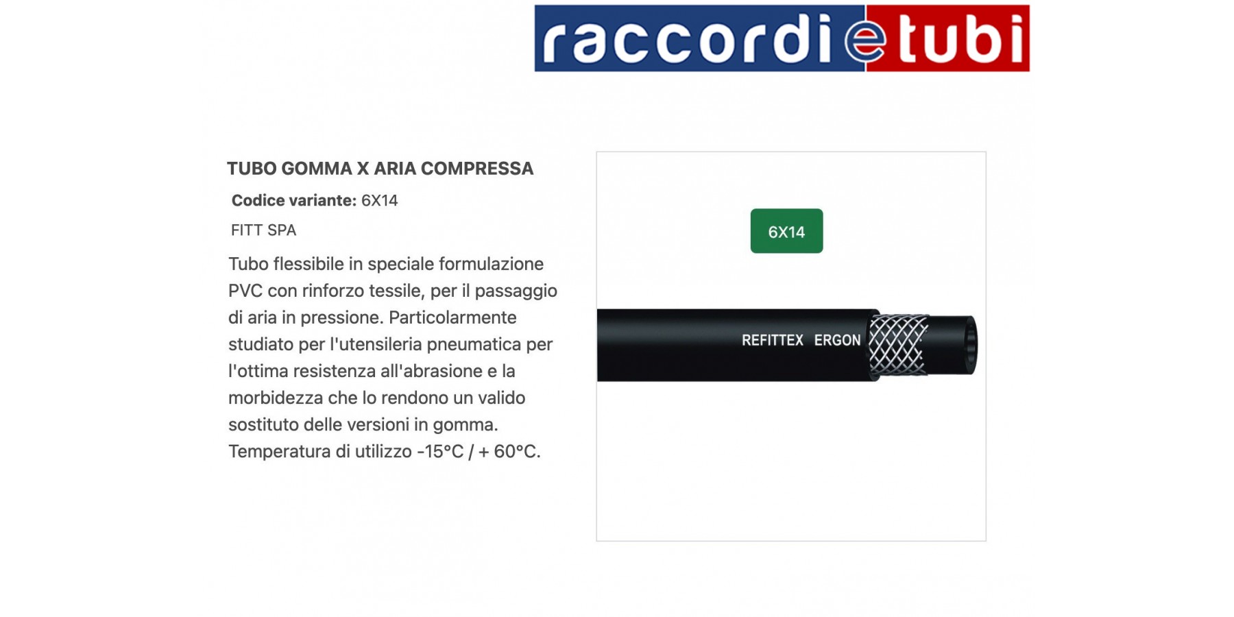 Tubo flessibile in speciale formulazione PVC con rinforzo tessile, per il passaggio di aria in pressione. Particolarmente studiato per l’utensileria pneumatica per l’ottima resistenza all’abrasione e la morbidezza che lo rendono un valido sostituto delle versioni in gomma. Temperatura di utilizzo: -15°C / + 60°C.