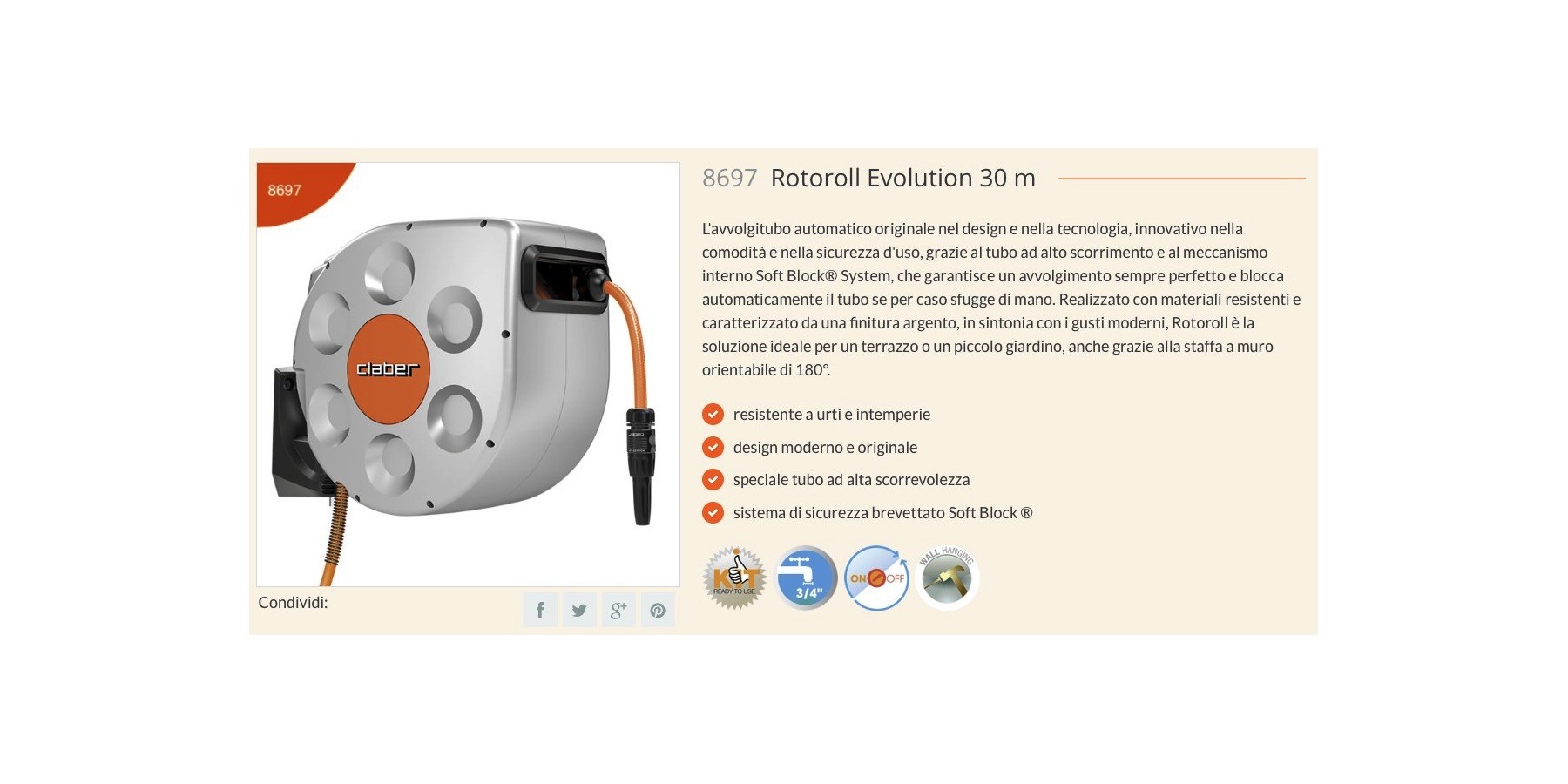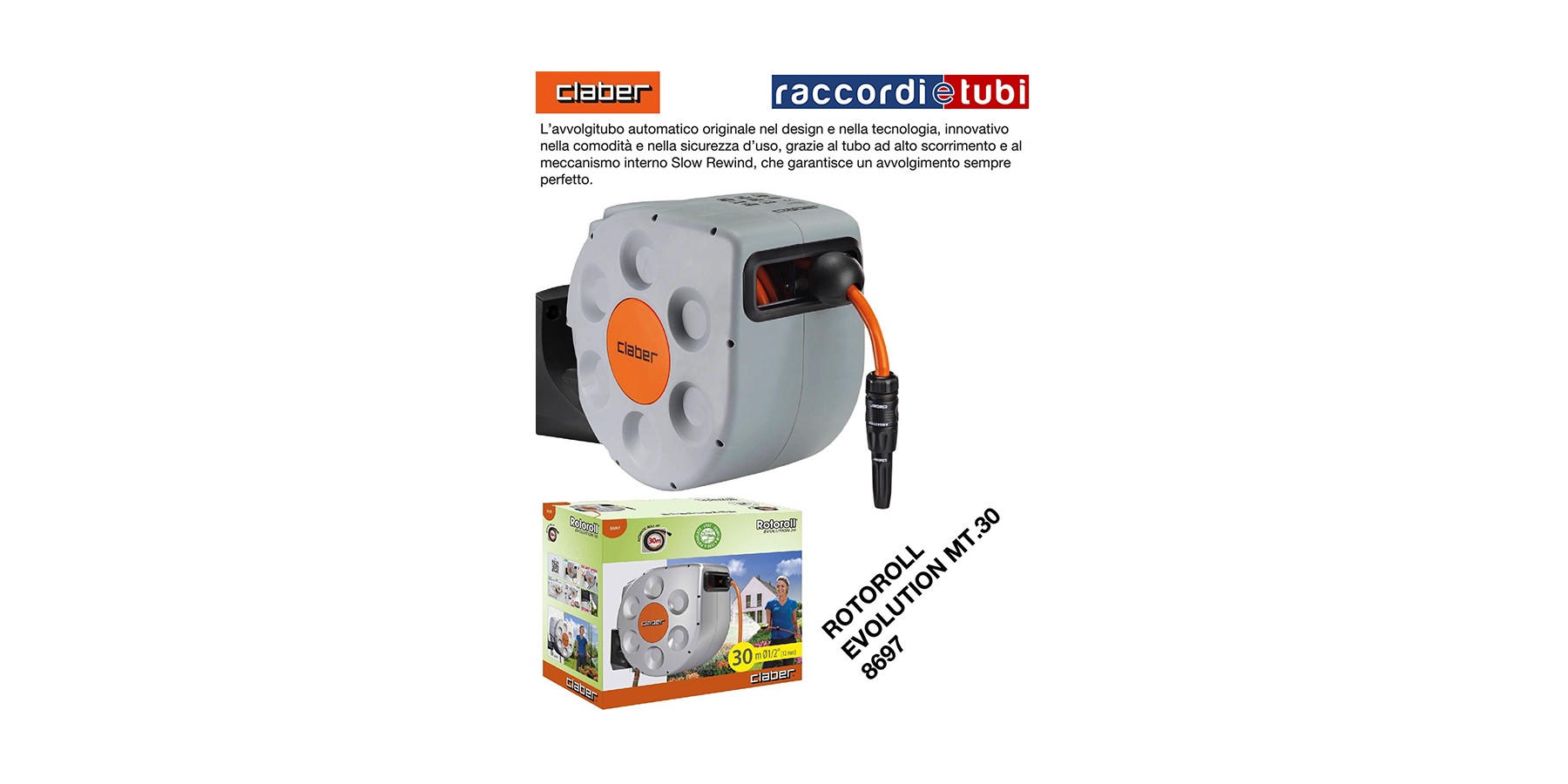 L'avvolgitubo automatico originale nel design e nella tecnologia, innovativo nella comodità e nella sicurezza d'uso, grazie al tubo ad alto scorrimento e al meccanismo interno Soft Block® System, che garantisce un avvolgimento sempre perfetto e blocca automaticamente il tubo se per caso sfugge di mano. Realizzato con materiali resistenti e caratterizzato da una finitura argento, in sintonia con i gusti moderni, Rotoroll è la soluzione ideale per un terrazzo o un piccolo giardino, anche grazie alla staffa a muro orientabile di 180°.Avvolgitubo con riavvolgimento automatico, dotato di esclusivo meccanismo Slow Rewind per un utilizzo confortevole e sicuro. Pronto all’uso con 20 m di tubo speciale indeformabile con superficie anti-attrito per un avvolgimento rapido e perfetto. Costruito con materiali resistenti agli urti e ai raggi solari per garantire la massima durata nel tempo. Il supporto a muro in resina rinforzata, con perno in alluminio inossidabile, permette di orientare fino a 180° l’avvolgitubo nella direzione di utilizzo, evitando pieghe e strozzamenti del tubo. Dotato di prolunga per il collegamento al rubinetto (1,5 m), presa 3/4” (20 - 27 mm) per il collegamento al rubinetto, raccordi automatici e lancia a spruzzo. Completo di supporto a muro, viti e tasselli per il montaggio a parete.