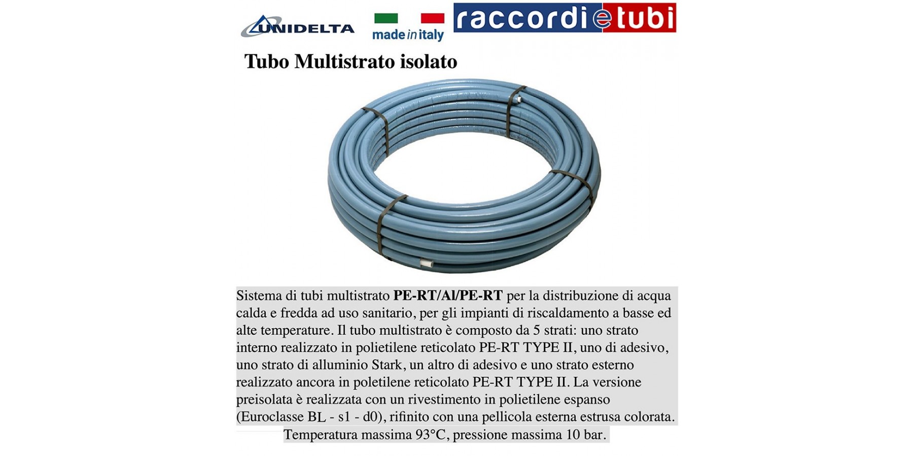 La versione prezzolata e' realizzata con un rivestimento in polietilene espanso (Euroclasse Bl-s1-d0)rifinito con una pellicola esterna estrusa colorata.Caratteristiche di servizio Temperatura massima 93°pressione massima 10 bar