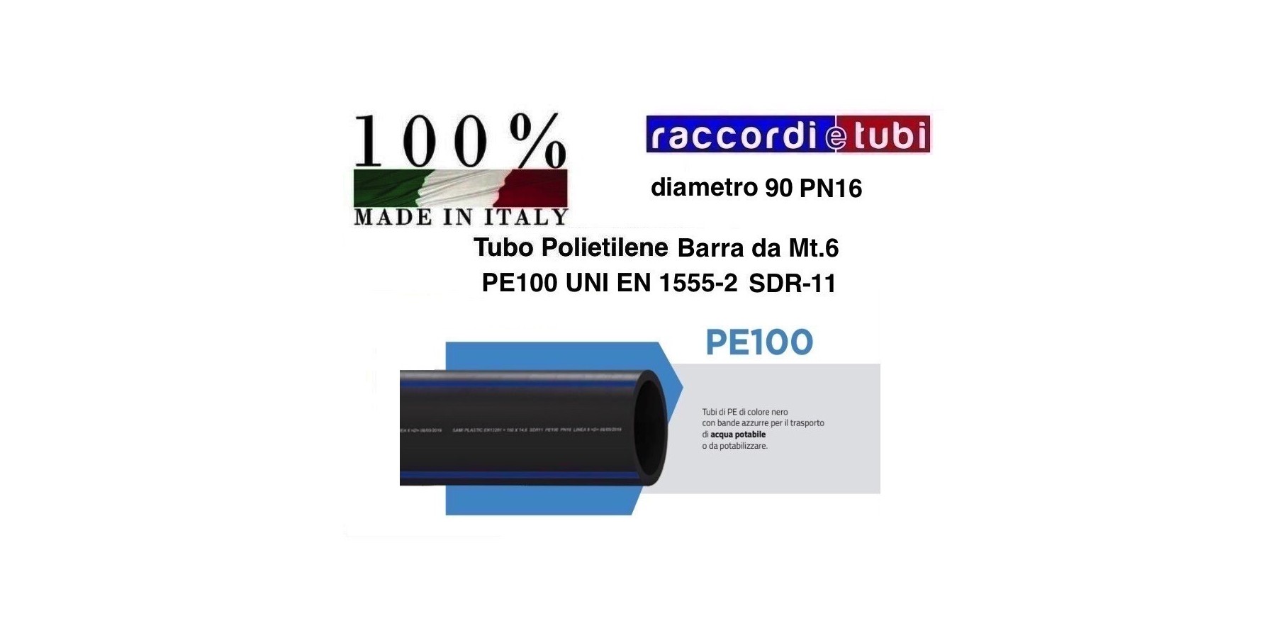 SPECIFICA TECNICA Tubi PE100 (MRS 10 MPa) di colore nero con bande azzurre coestruse sulla superficie esterna, interamente rispondenti alla norma UNI EN 12201, per trasporto di liquidi in pressione, dotati di certificati di rispondenza alle disposizioni del Ministero della Sanità relative ai manufatti per liquidi alimentari (Dec. Min. n. 174 del 6 Aprile 2004