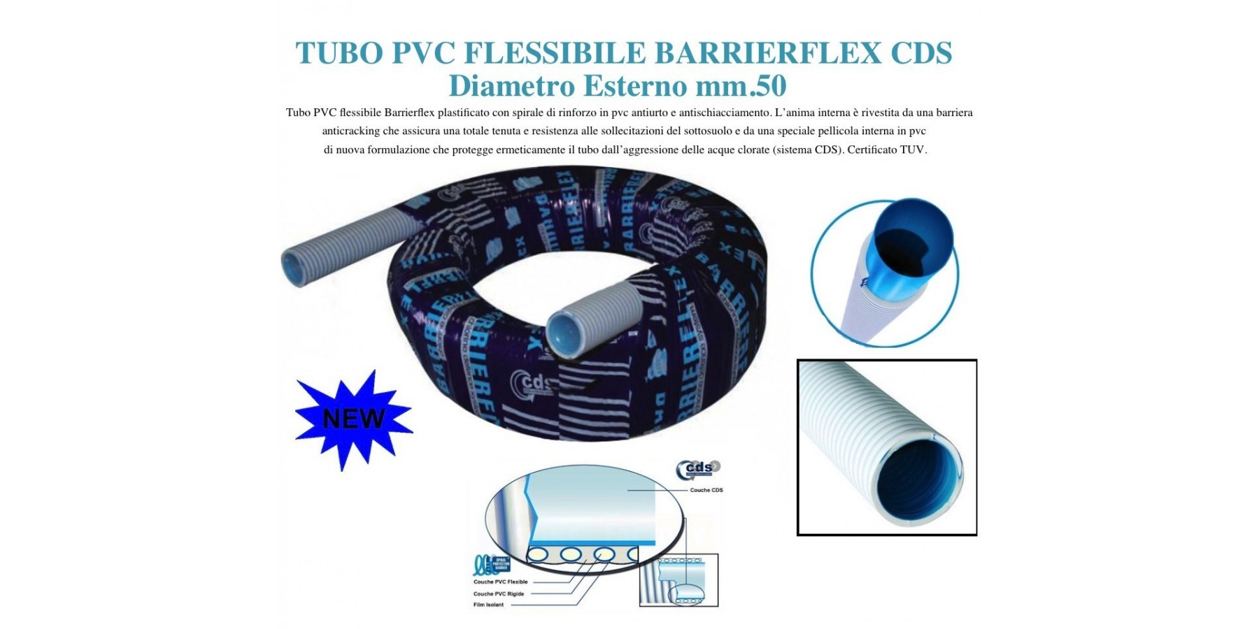 Tubo PVC flessibile Barrierflex plastificato con spirale di rinforzo in pvc antiurto e antischiacciamento. L’anima interna è rivestita da una barriera anticracking che assicura una totale tenuta e resistenza alle sollecitazioni del sottosuolo e da una speciale pellicola interna in pvc di nuova formulazione che protegge ermeticamente il tubo dall’aggressione delle acque clorate (sistema CDS). Certificato TUV.