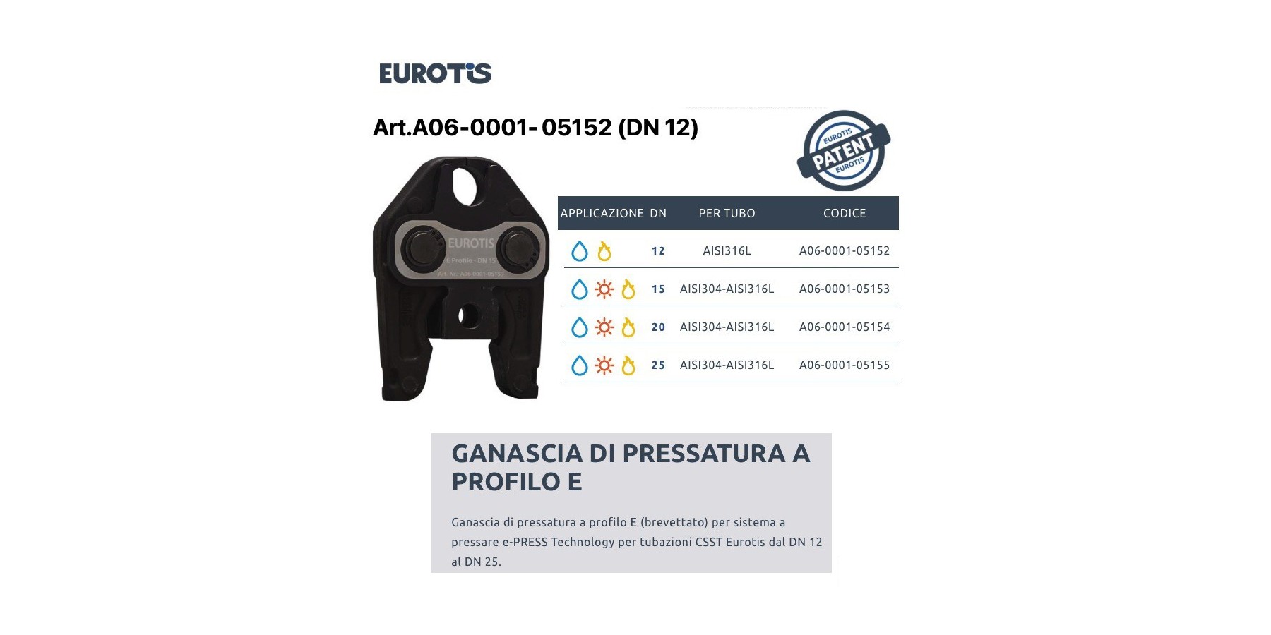 Ganascia di pressatura a profilo E (brevettato) per sistema a pressare e-PRESS Technology per tubazioni CSST Eurotis DN 12