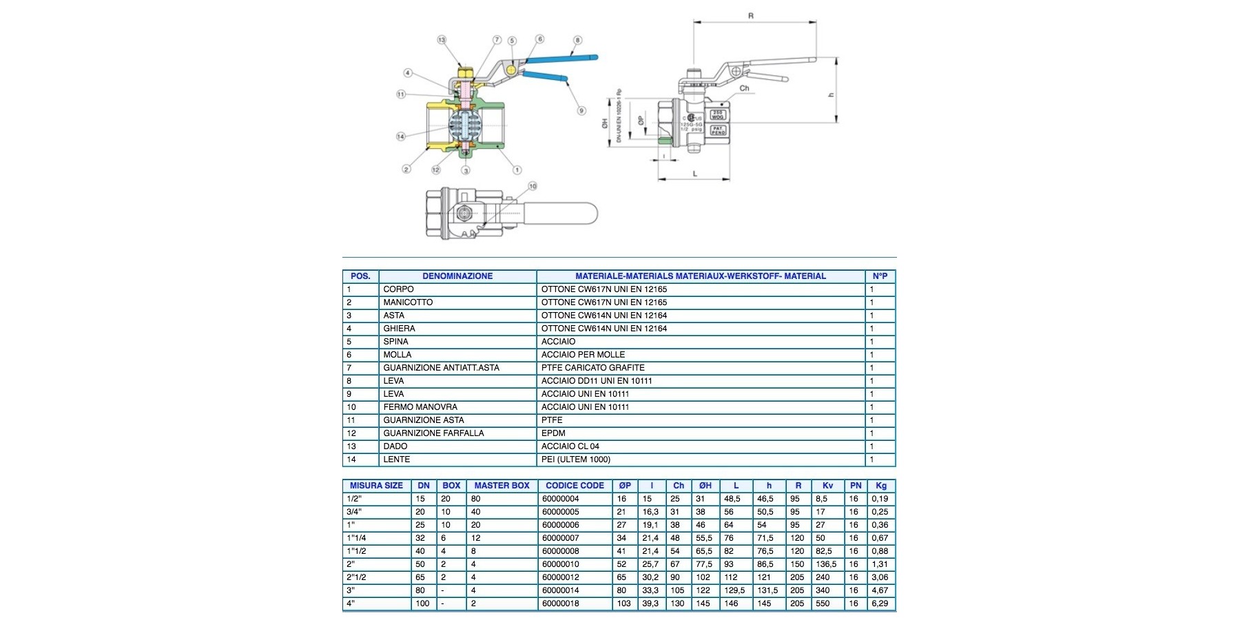 Valvola a farfalla in ottone, a passaggio totale, filettatura F/F, con sistema di regolazione del flusso.