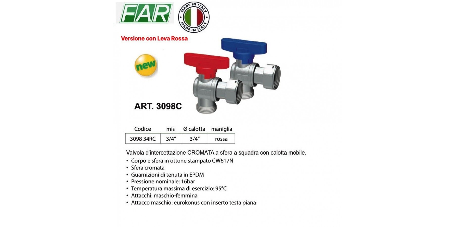 Valvola d’intercettazione CROMATA a sfera a squadra con calotta mobile. • Corpo e sfera in ottone stampato CW617N