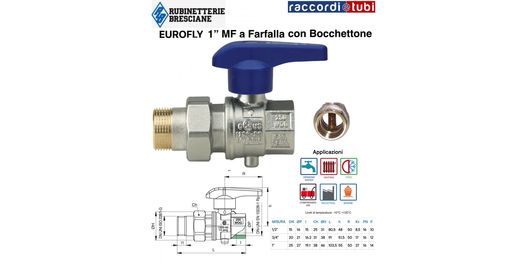 Valvola a farfalla in ottone con Bocchettone ,a passaggio totale M/F con leva corta e sistema di regolazione del flusso