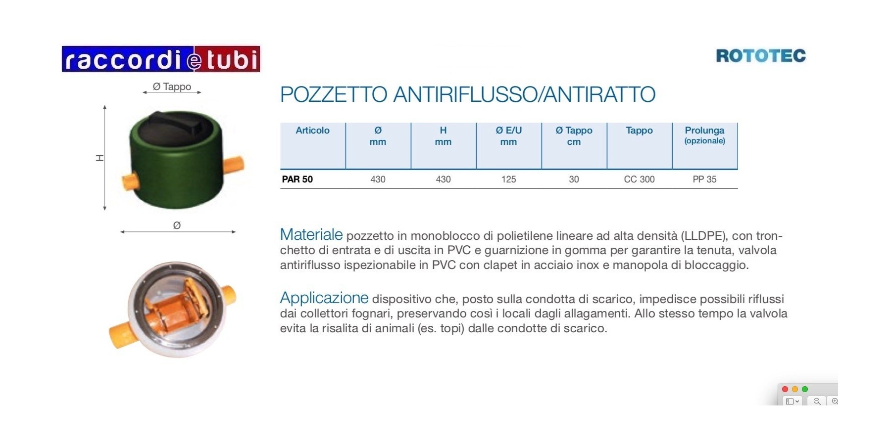 SCHEDA TECNICA POZZETTO ANTIRIFLUSSO/ANTIRATTO Materiale: pozzetto in monoblocco di polietilene lineare ad alta densità (LLDPE), con tronchetto di entrata e di uscita in PVC e guarnizione in gomma per garantire la tenuta, valvola antiriflusso ispezionabile in PVC con clapet in acciaio inox e manopola di bloccaggio. Funzione: dispositivo che, posto sulla condotta di scarico, impedisce possibili riflussi dai collettori fognari, garantendo così i locali dagli allagamenti. Allo stesso tempo la valvola evita la risalita di animali (es. topi) dalle condotte di scarico.