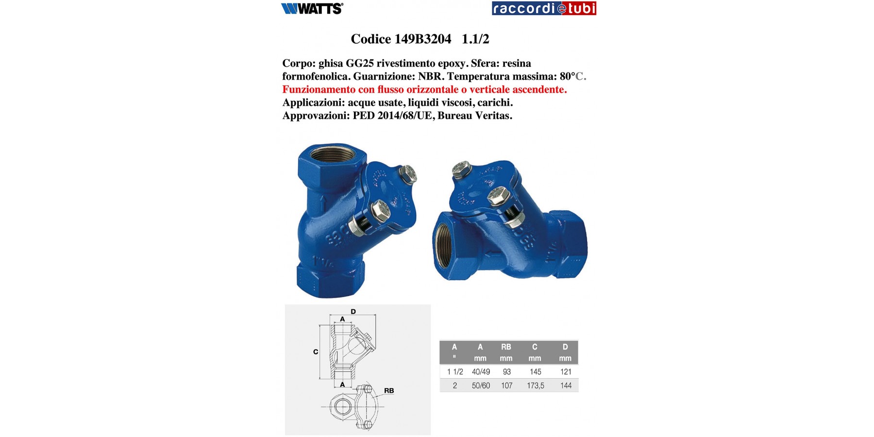 Corpo: ghisa GG25 rivestimento epoxy. Sfera: resina formofenolica. Guarnizione: NBR. Temperatura massima: 80°C. Funzionamento con flusso orizzontale o verticale ascendente. Applicazioni: acque usate, liquidi viscosi, carichi.