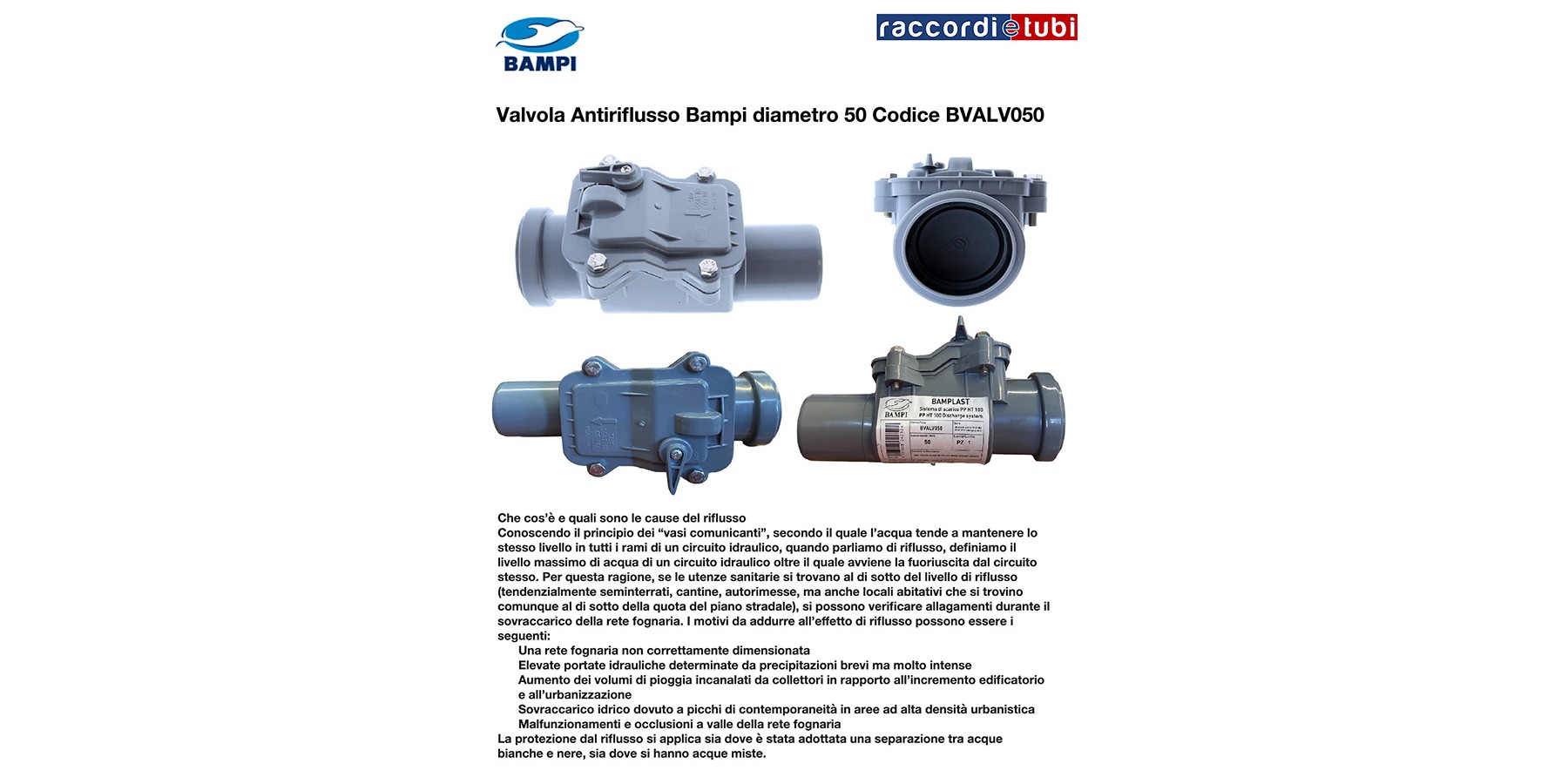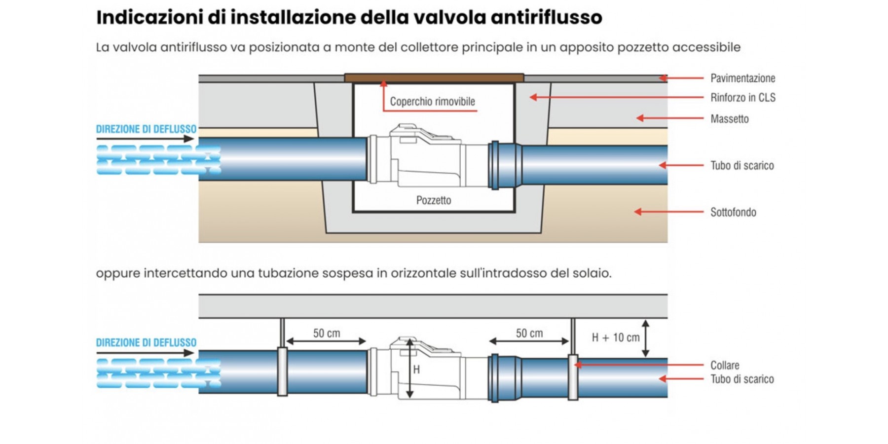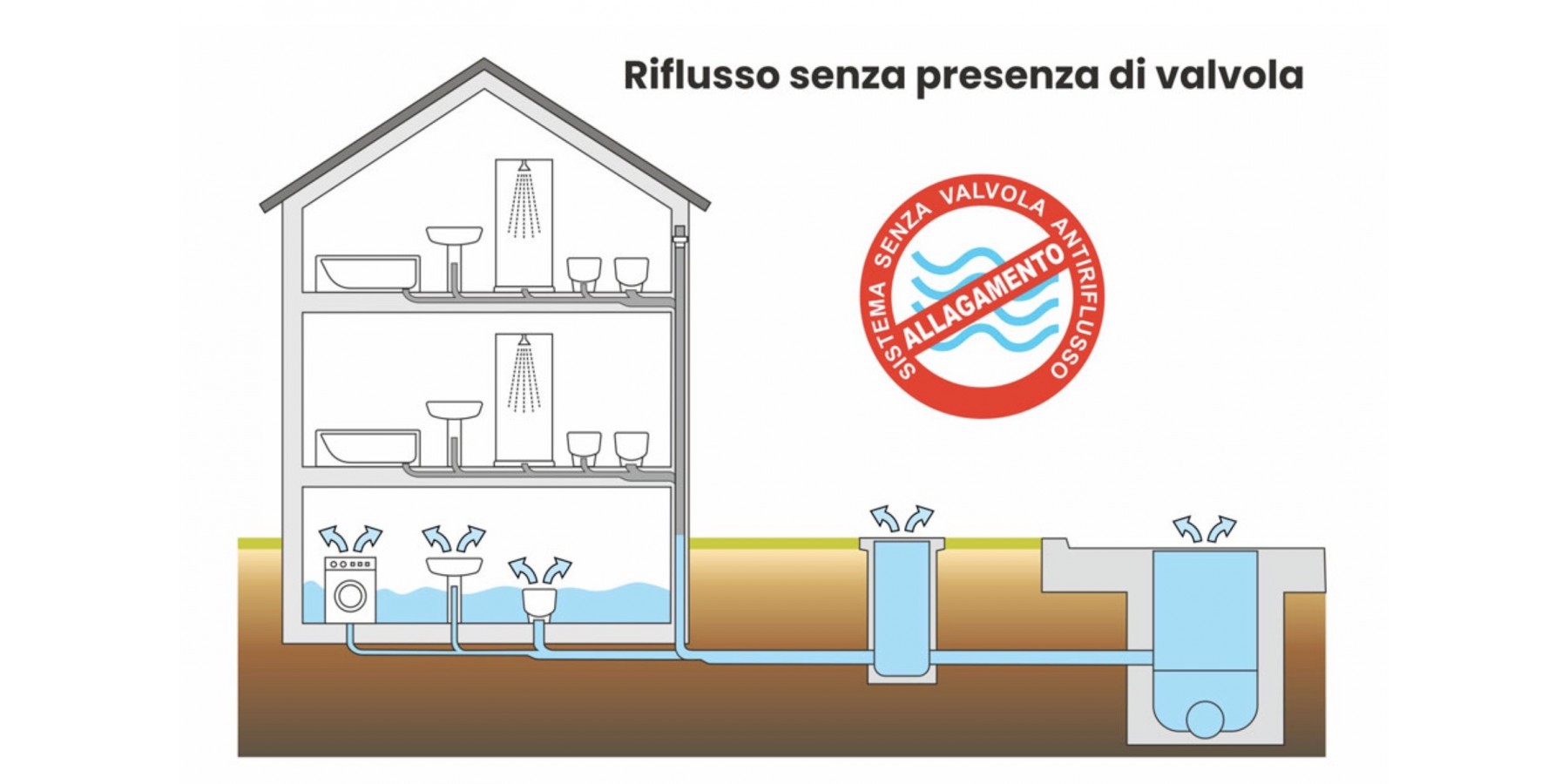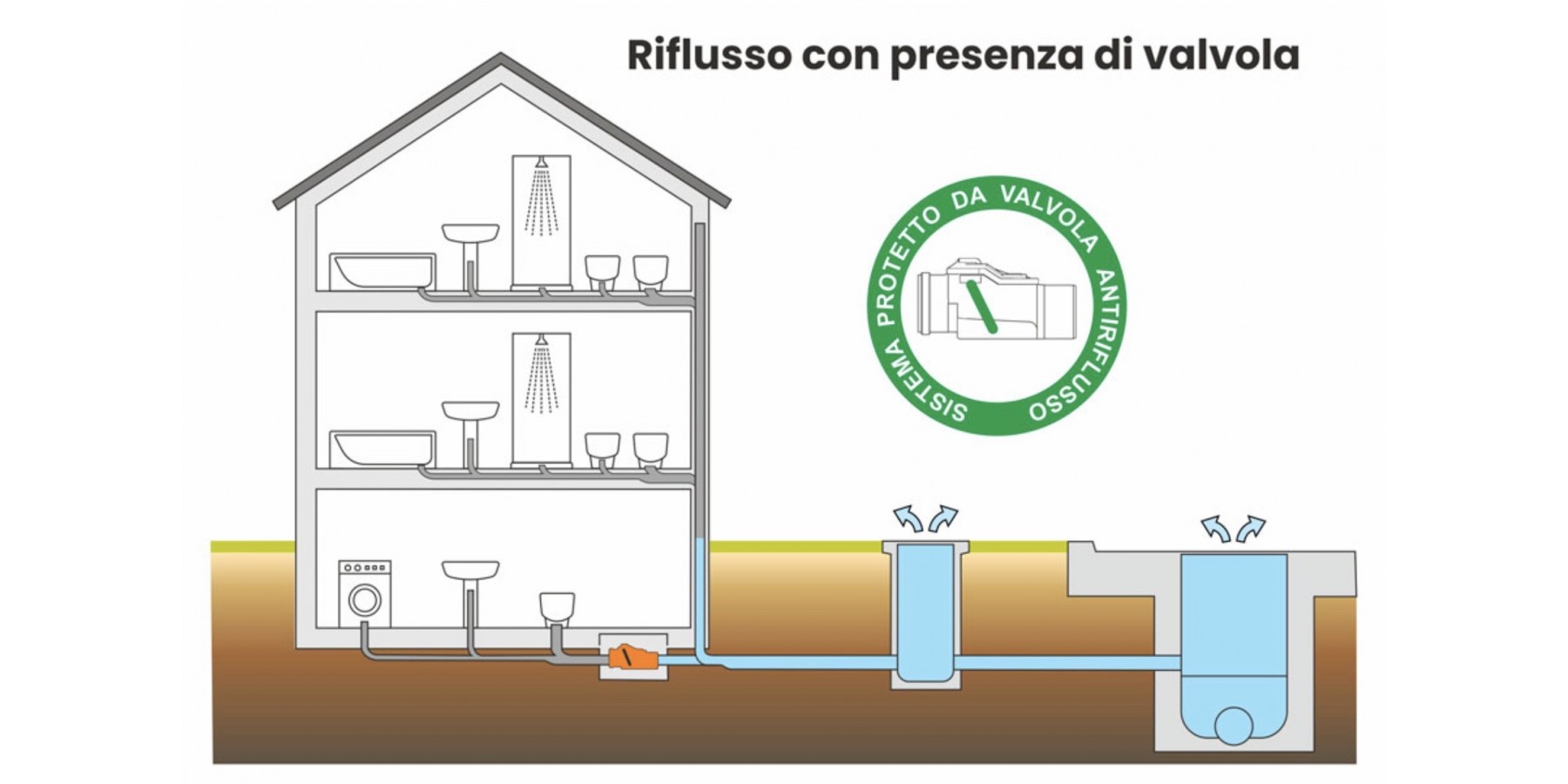 La valvola antiriflusso trova spazio in un apposito pozzetto accessibile ed ispezionabile. Il suo ruolo è quello di creare un’efficace barriera ad ogni eventuale ritorno di flusso idrico proveniente dalla rete fognaria durante ogni possibile evento di sovraccarico. La valvola antiriflusso è dotata di un piattello in acciaio inox basculante in direzione del flusso idrico di uscita dal fabbricato verso la rete fognaria. Nel caso di un riflusso, il piattello si chiude meccanicamente con la spinta dell’acqua. Il piattello, agendo su un’apposita leva, può essere bloccato ermeticamente in modo permanente. La valvola antiriflusso viene prevista in fase di progettazione e dimensionamento del sistema di scarico dell’edificio secondo UNI 12056-3. Altresì il suo impiego è assolutamente consigliato in edifici esistenti, dove sia possibile intervenire sulla tubazione di allaccio alla rete fognaria e vi sia lo spazio fisico per realizzare un pozzetto che accolga la valvola. La valvola antiriflusso deve essere omologata in accordo alla norma europea EN 13564-1:2003 che ne garantisce i requisiti, come ad esempio: l’efficacia di deflusso, l’indeformabilità, la resistenza, la tenuta idraulica, la conformità d’allaccio, il corretto azionamento di apertura/chiusura.