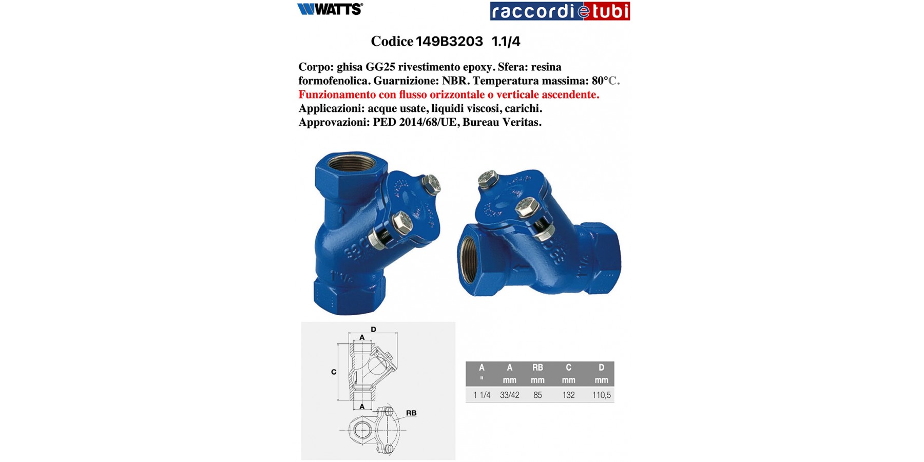 Corpo: ghisa GG25 rivestimento epoxy. Sfera: resina formofenolica. Guarnizione: NBR. Temperatura massima: 80°C. Funzionamento con flusso orizzontale o verticale ascendente. Applicazioni: acque usate, liquidi viscosi, carichi.