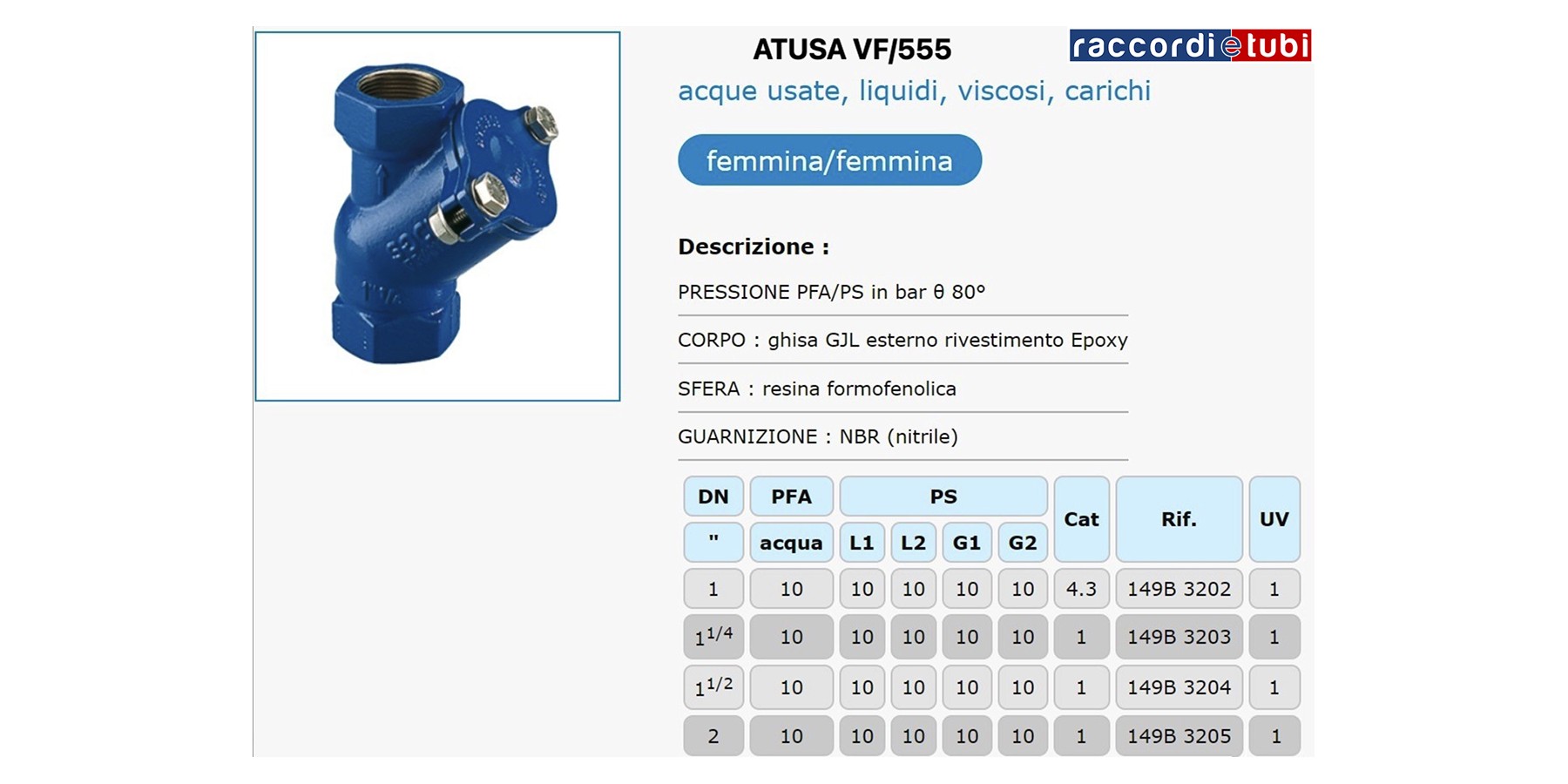 Valvola di ritegno a sfera con attacco filettato per drenaggio acque reflue. Filettatura interna da 1" Installazione verticale. La pressione di esercizio va da 0.3 a 10 bar. Intervallo di temperatura del liquido da -10 a 80 gradi centigradi.