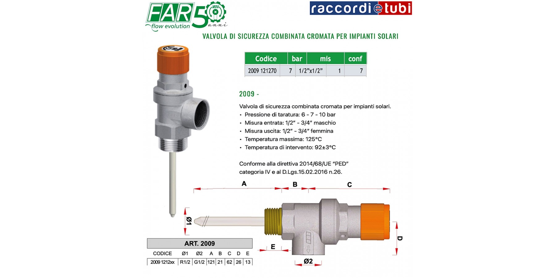 Valvola di sicurezza combinata, in ottone cromata, per impianti termici e sanitari, con attacco entrata da 1/2” maschio, attacco in uscita da 1/2” femmina, volantino per apertura manuale con dischetto serigrafato con l’indicazione della pressione di taratura. Conforme alla direttiva 2014/68/UE “PED” categoria IV al d.Lgs.15.02.2016 n.26. Temperatura di taratura 92±3°C. Pressione di taratura 7 BAR. Temperatura max di esercizio 125°C.