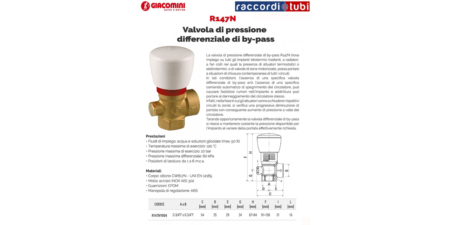 Valvola di pressione differenziale di by-pass per impianti di climatizzazione. Attacchi G 3/4”F x G 3/4”F. Fluidi di impiego: acqua e soluzioni glicolate (max. 50 %). Temperatura massima di esercizio: 120 °C. Pressione massima di esercizio: 10 bar. Pressione massima differenziale: 60 kPa. Posizioni di taratura: da 1 a 6 m.c.a. Corpo: ottone CW617N - UNI EN 12165. Molla: acciaio INOX AISI 302. Guarnizioni: EPDM. Manopola di regolazione: ABS.