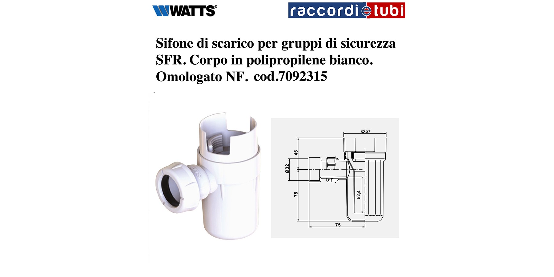 Sifone di scarico per gruppi di sicurezza SFR. Corpo in polipropilene bianco. Omologato NF. 1" Femmina