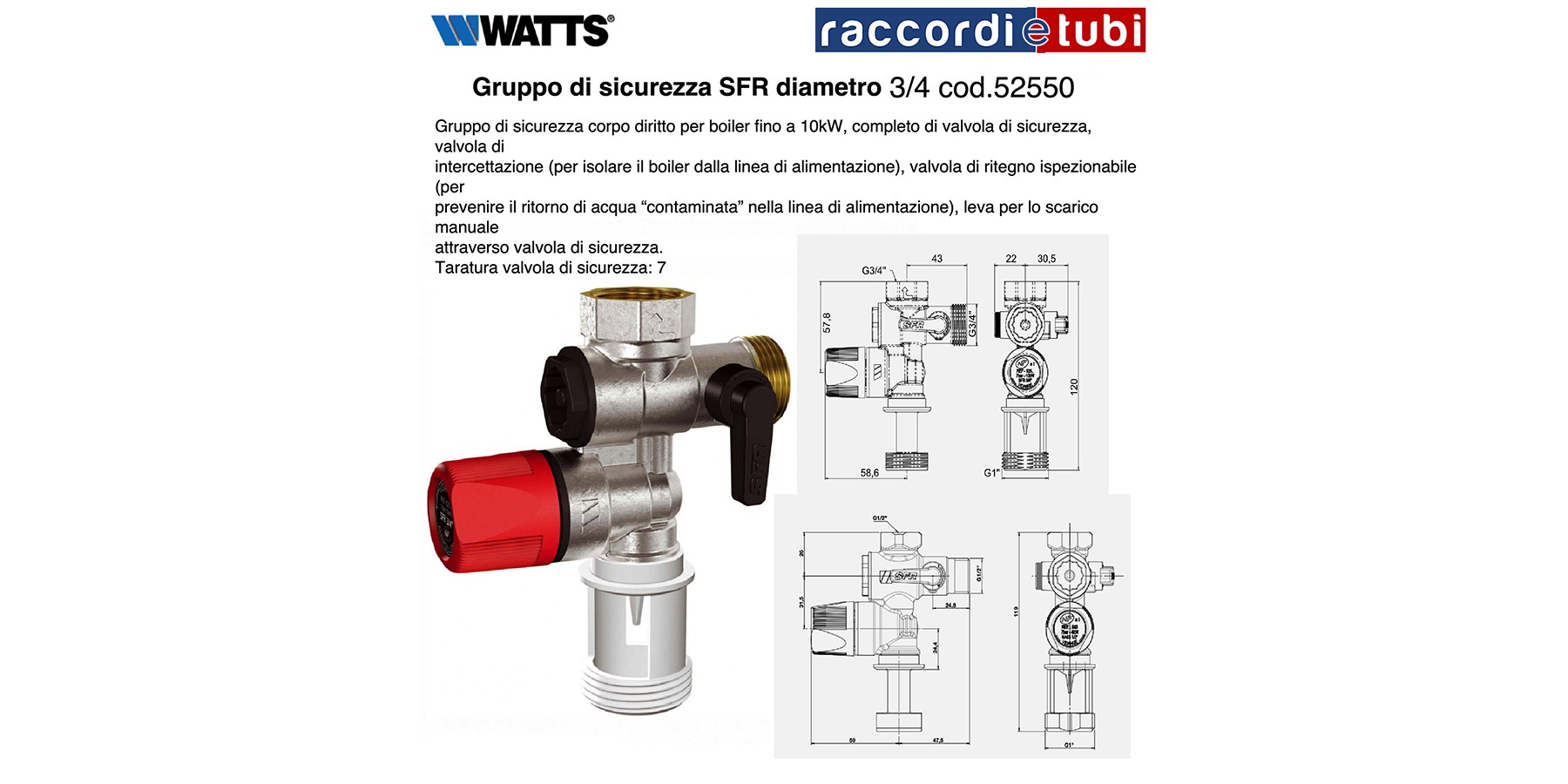 Gruppo di sicurezza corpo diritto per boiler fino a 10kW, completo di valvola di sicurezza, valvola di intercettazione (per isolare il boiler dalla linea di alimentazione), valvola di ritegno ispezionabile (per prevenire il ritorno di acqua “contaminata” nella linea di alimentazione), leva per lo scarico manuale attraverso valvola di sicurezza.