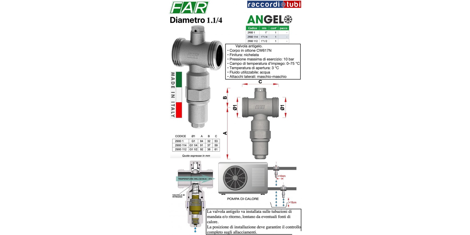 La valvola antigelo FAR art.2900 va installata all’esterno, in posizione verticale, sulle tubazioni di impianti di riscaldamento/raffrescamento con pompa di calore. Nel caso di pompe di calore con unità esterna esiste la possibilità che l’acqua contenuta nelle tubazioni di collegamento con l’unità interna, nelle condizioni di impiego invernali dove in esterno si possono raggiungere anche temperature molto basse, possa gelare compromettendo il regolare funzionamento dell’impianto o provocare rotture. La valvola interviene ad una temperatura prossima a 3°C e, grazie ad un sensore interno, permette l’apertura di un piccolo foro con il conseguente gocciolamento verso l’ambiente esterno, impedendo così il congelamento dell’acqua all’interno delle tubazioni. Da utilizzare in alternativa al glicole.