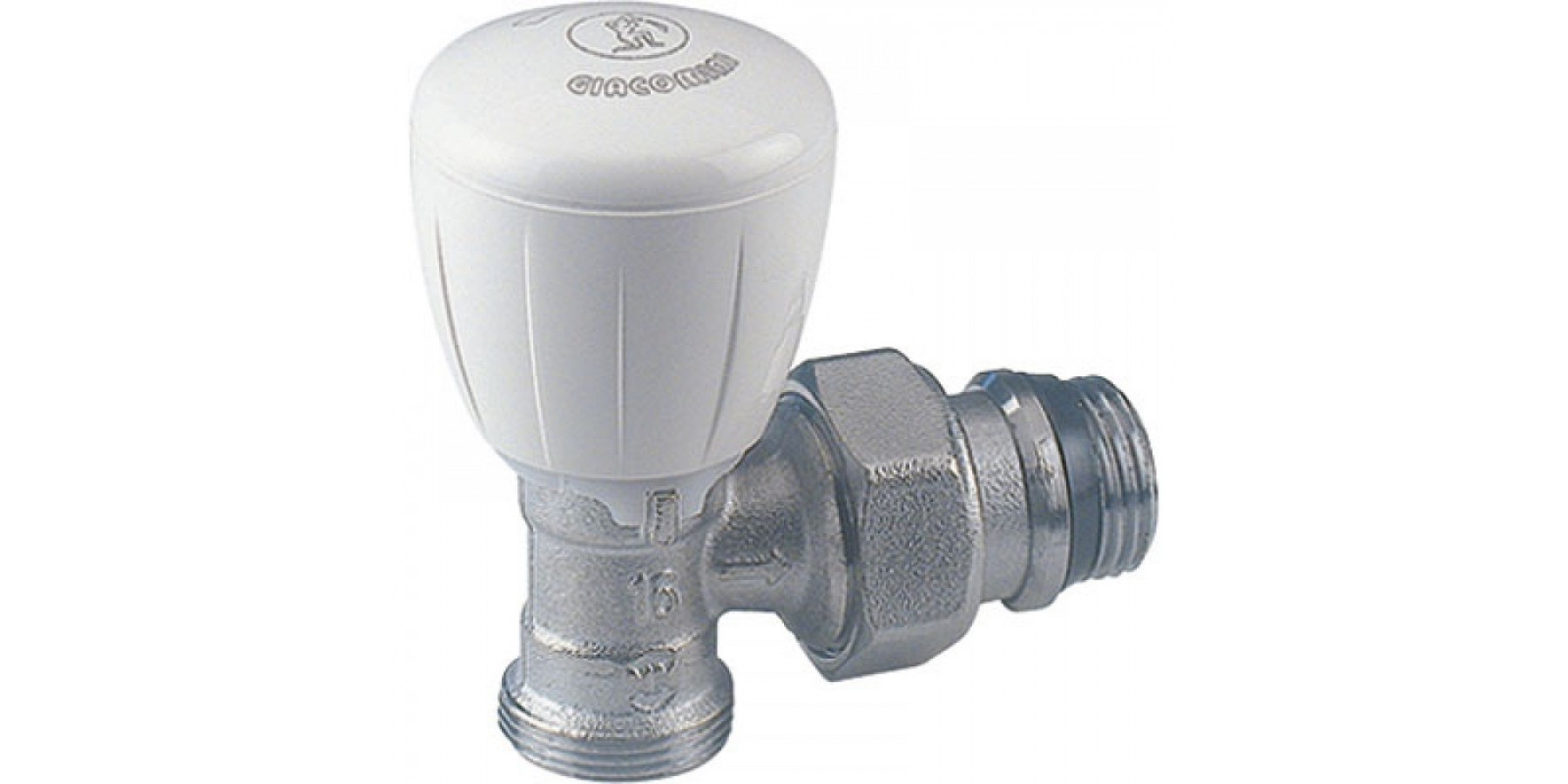 Valvola micrometrica termostatizzabile, a squadra, in ottone, cromata, con attacco per adattatore tubo rame, plastica o multistrato.