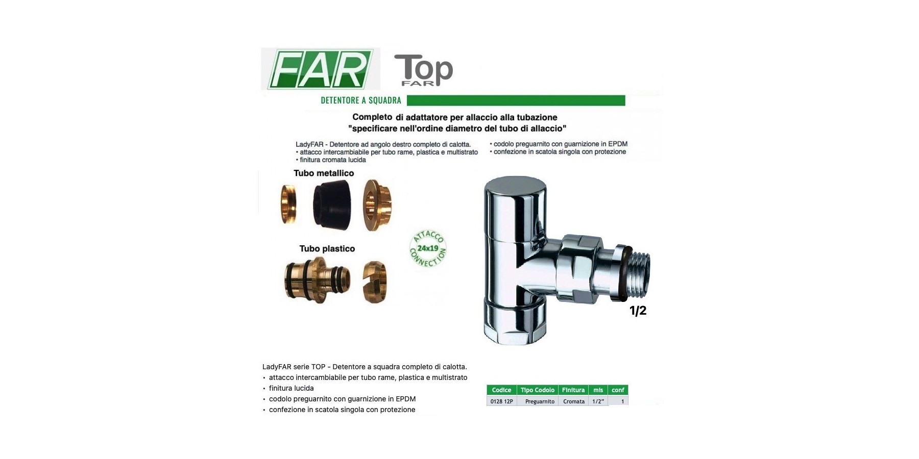 Detentore LadyFAR serie TOP a squadra per radiatori finitura lucida cromata con attacco per tubo rame plastica e multistrato, codolo con guarnizione in EPDM, tenuta tra codolo e corpo valvola in HPF, doppio o-ring di tenuta sull’asta, otturatore a battuta metallica, cappuccio in ottone cromato e completo di calotta cromata. Temperatura max d’esercizio 95°C. Pressione max d’esercizio 10 bar.