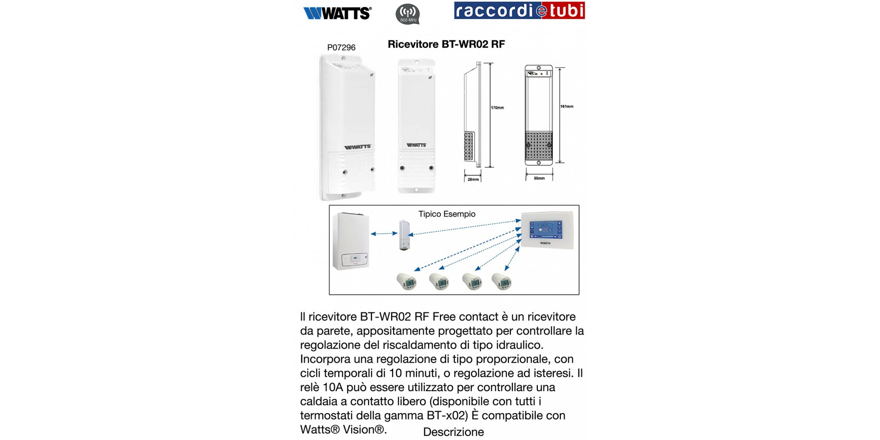 - Il ricevitore BT-WR02 RF è un ricevitore con montaggio a parete studiato per controllare gli impianti di regolazione del riscaldamento con un termostato wireless BT-DP02 RF.