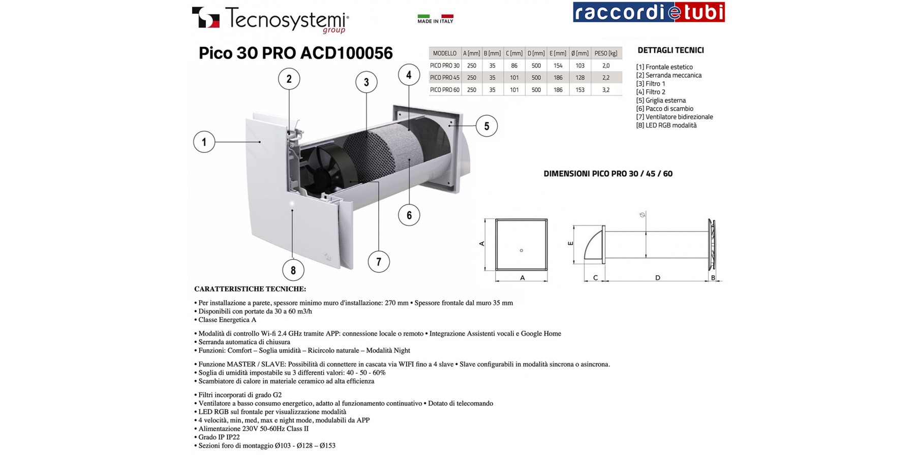 Elevato Rendimento: L'aspiratore-estrattore integrato in PICO PRO offre un elevato rendimento, con la capacità di estrazione che può raggiungere fino al 90%. Ciò è reso possibile dalla presenza di uno scambiatore di calore a struttura alveolare realizzato in materiale ceramico, il che massimizza l'efficienza termica.